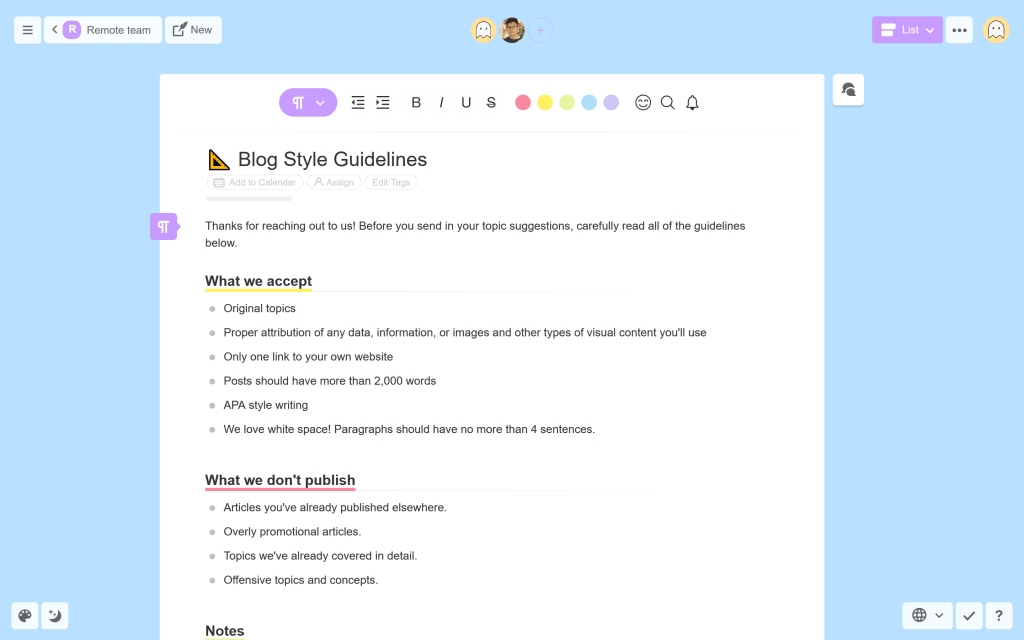 Onboarding a new team member or hiring contractors to help out with the workload? Start by customizing the Blog Style Guidelines template and sharing it with the freelance writers 🖋and editors you work with:
