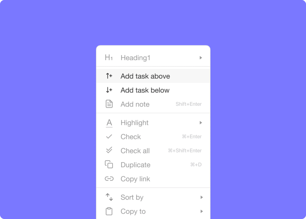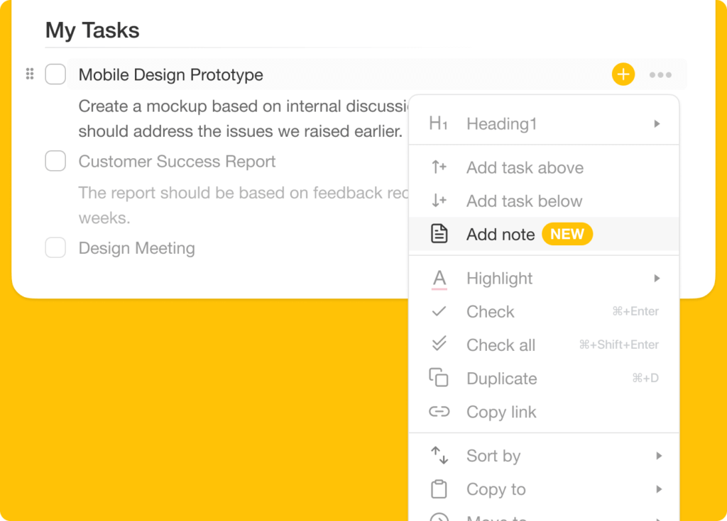Add notes below your tasks to include more information. Use the Shift + Enter shortcut to add a note and Press Enter Twice to resume adding tasks.