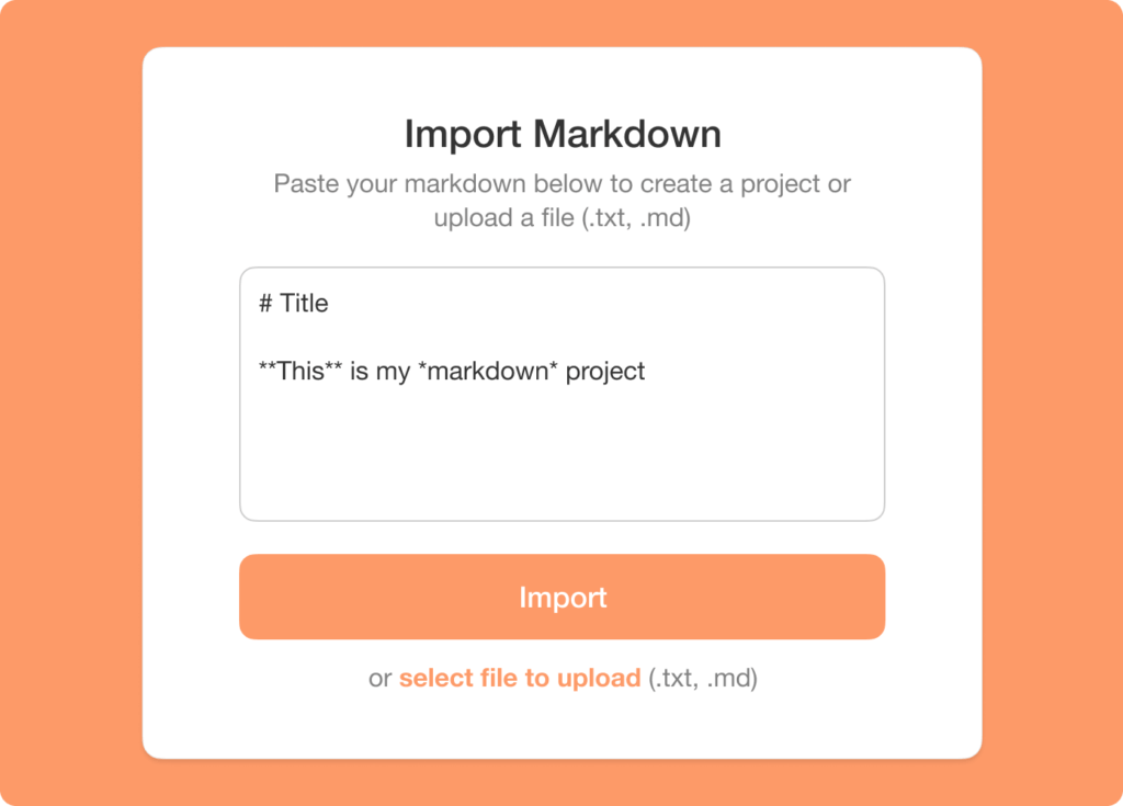 You can now import markdown into Taskade. Click on Import in the new project drop-down menu and choose Markdown.
