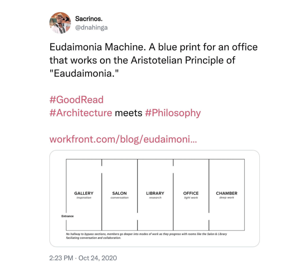 Created by Chicago-based architect David Dewane, the Eudaimonia Machine is a conceptual approach to modern office planning. In a nutshell, Dewane’s project divides an office space into a series of rooms, each designed to support deep, focused work.