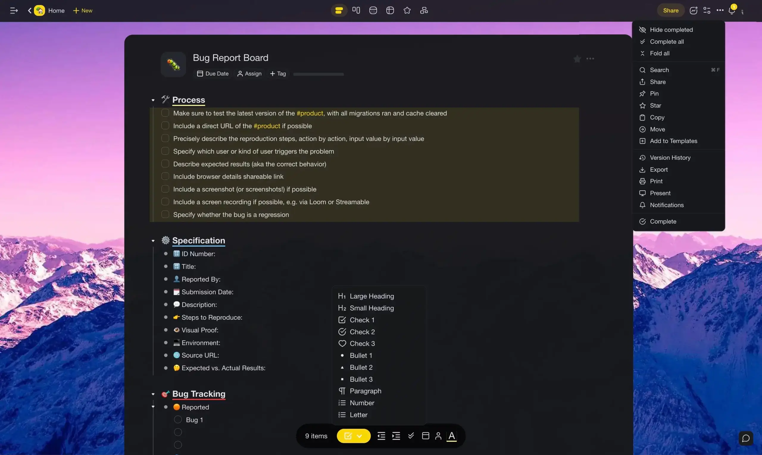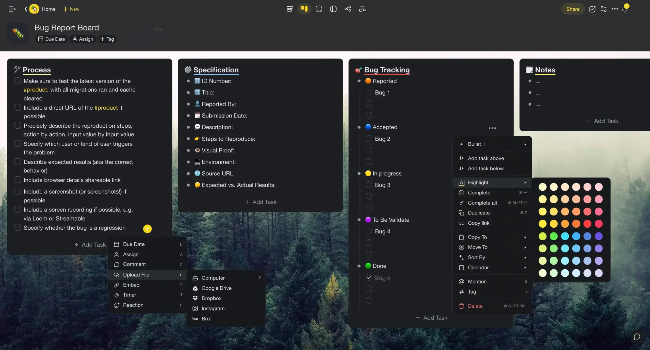 Of course, Taskade lets you customize your boards by changing the accent color and uploading your own project backgrounds. Text formatting options include several bullet styles, headings, and highlights, so you can tailor the workflow to match your unique work style.