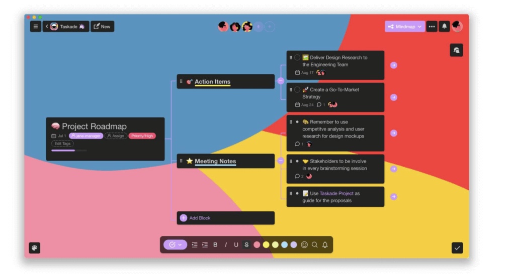 You can use Taskade to visualize project/product roadmaps so your team always knows which items require immediate attention. Adding a visual aspect to the planning stage makes it much easier to spot possible obstacles and bottlenecks down the road.