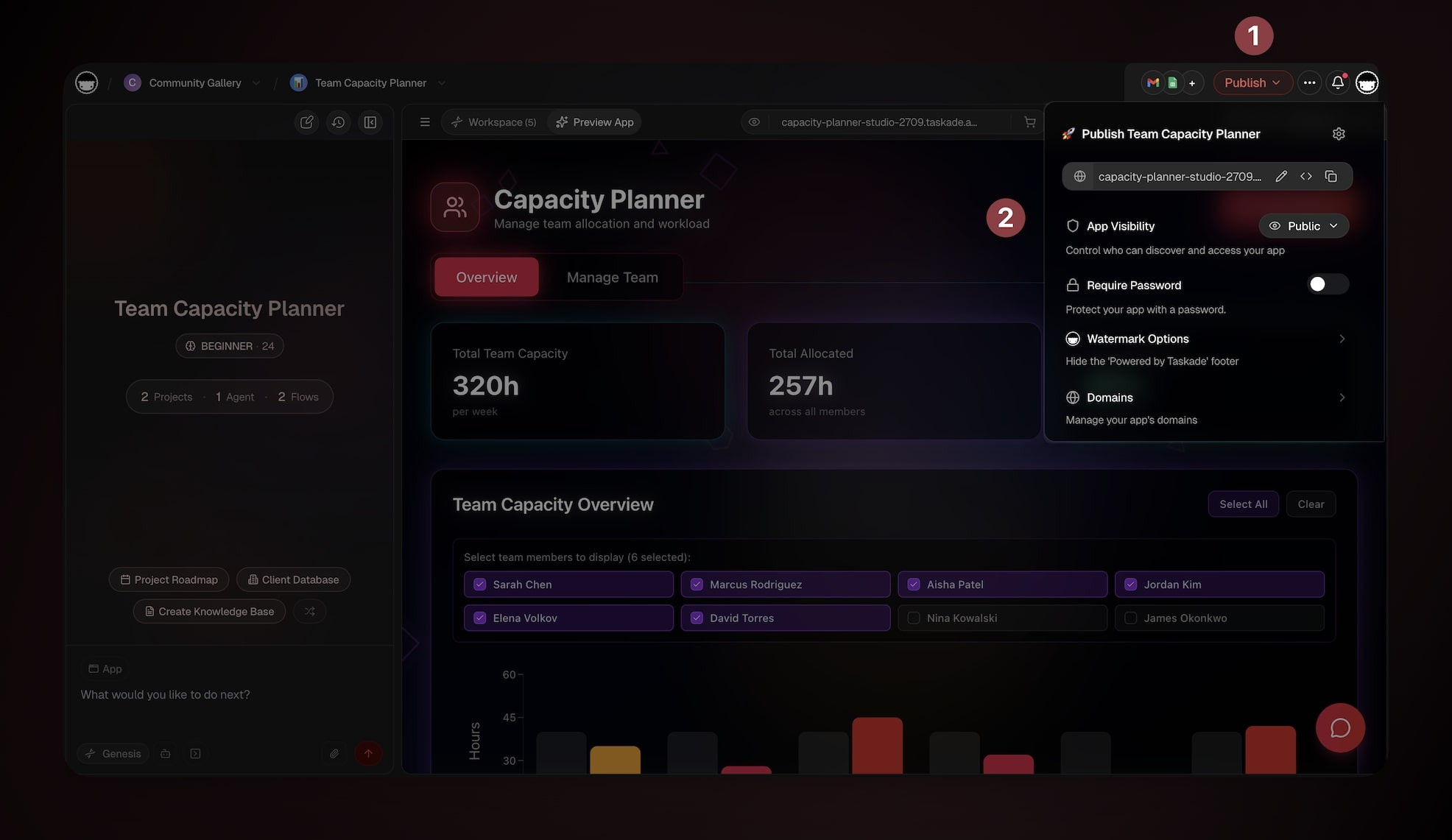 taskade.com/a/your-appwith anyone - Custom domain — point your own domain at the app with automatic SSL. See Custom domains