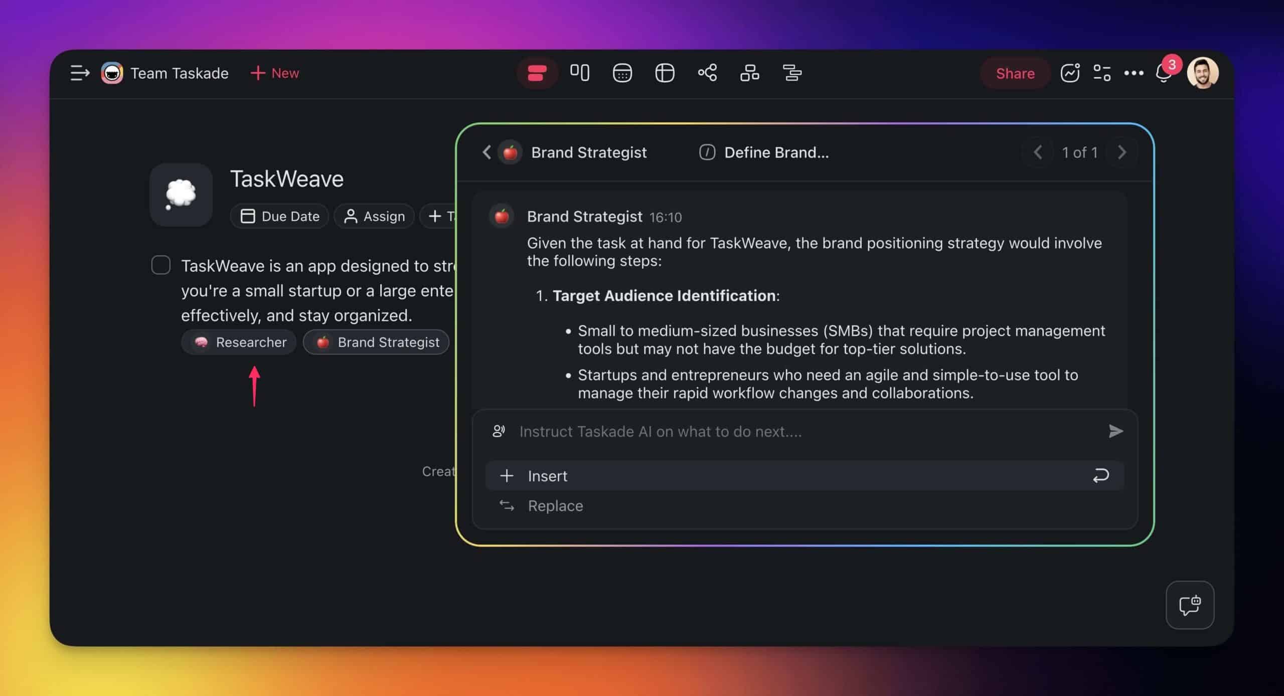💡 Taskade lets you build multi-agent systems and run them concurrently within projects. The "pills" under each task indicate which agent is assigned and if the task is in progress.