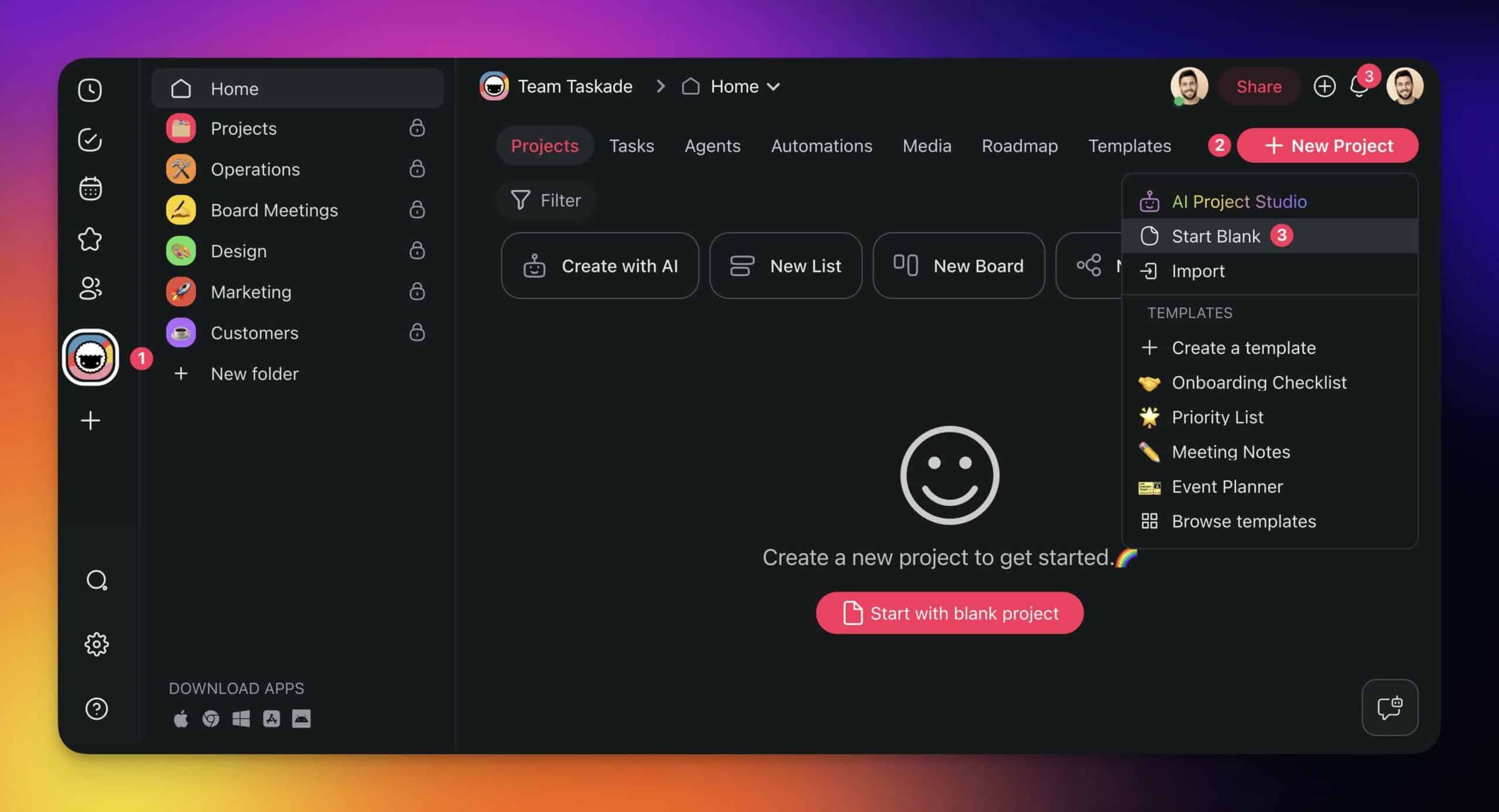 Go to the workspace where your agents are, click ➕ New Project, and choose Start Blank.