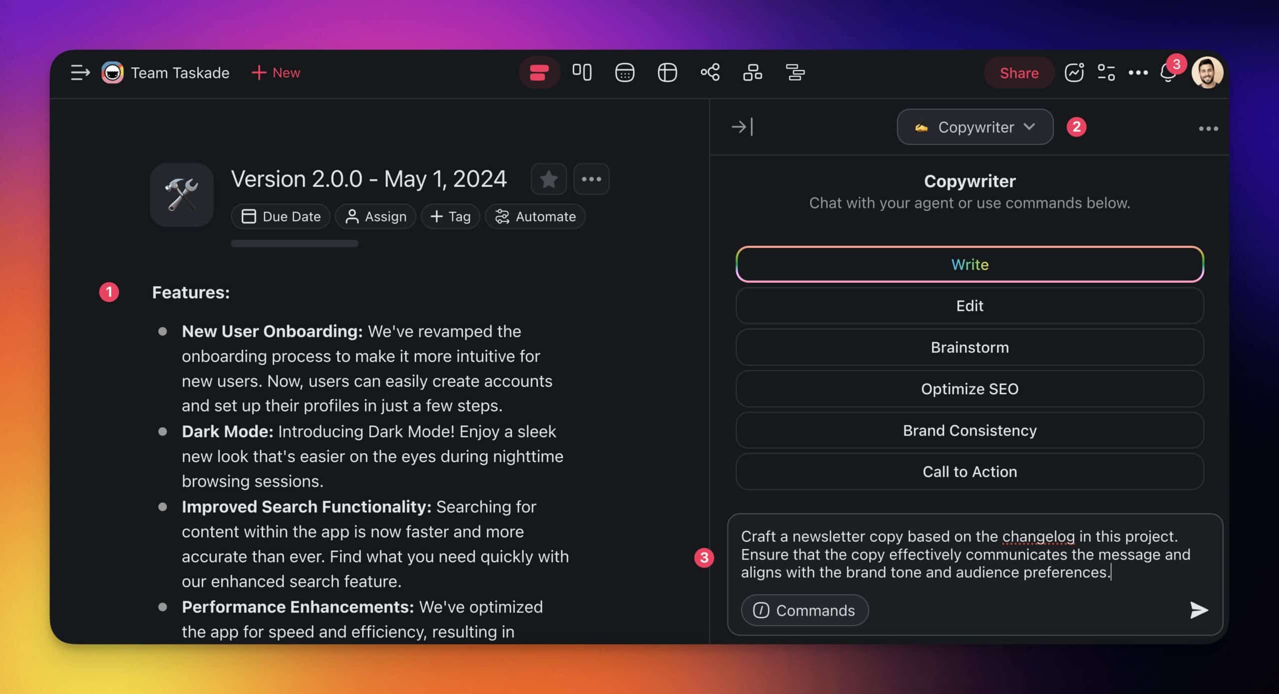 All you have to do is: 1) paste the changelog into the new project, 2) open the Chat (bottom-right), 3) use the selector at the top to choose the ✍️ Copywriter agent, and 4) tell the agent what you need.