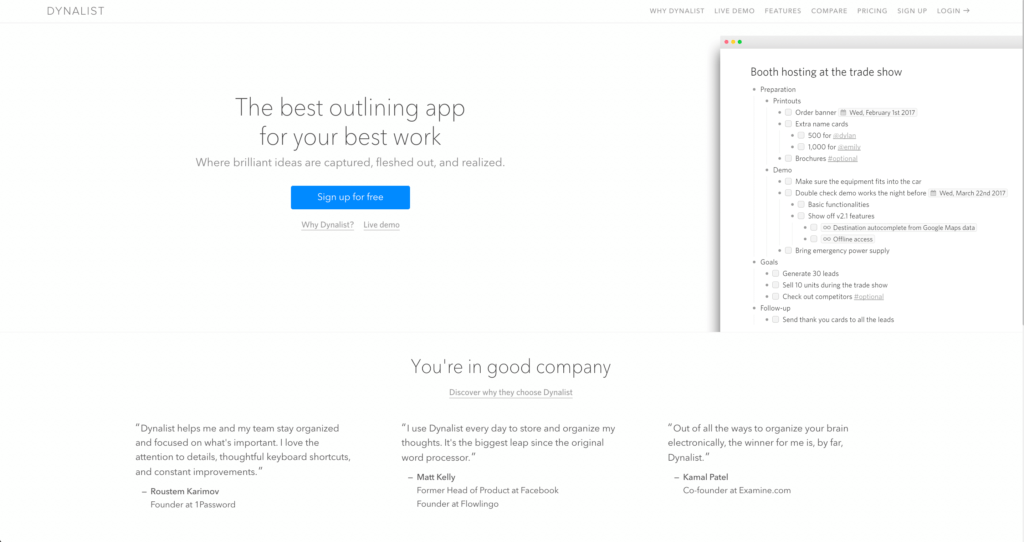 In terms of task and project management, Dynalist has standard features to help you manage your to-do lists. Task management is done by creating a checklist on Dynalist. After populating your checklist with tasks, you can set due dates and also set a task to repeat if it’s a recurring one.