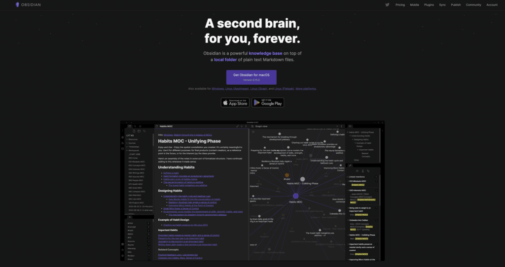 Obsidian can be used with local folders or external/proprietary sync and is based on plain text Markdown files.
