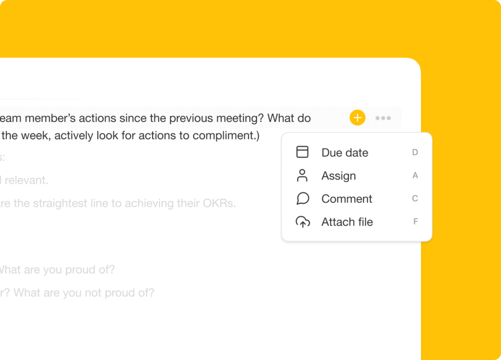As you're creating a new task, pressĀ ā + /Ā (Mac)Ā orĀ CTRL + /Ā (Windows)Ā to open the add-on menu then pressĀ DĀ to add a due date,Ā AĀ to assign,Ā CĀ to comment, orĀ FĀ to attach a file. You can also use arrow keys to navigate between different options andĀ ESCĀ to continue typing.
