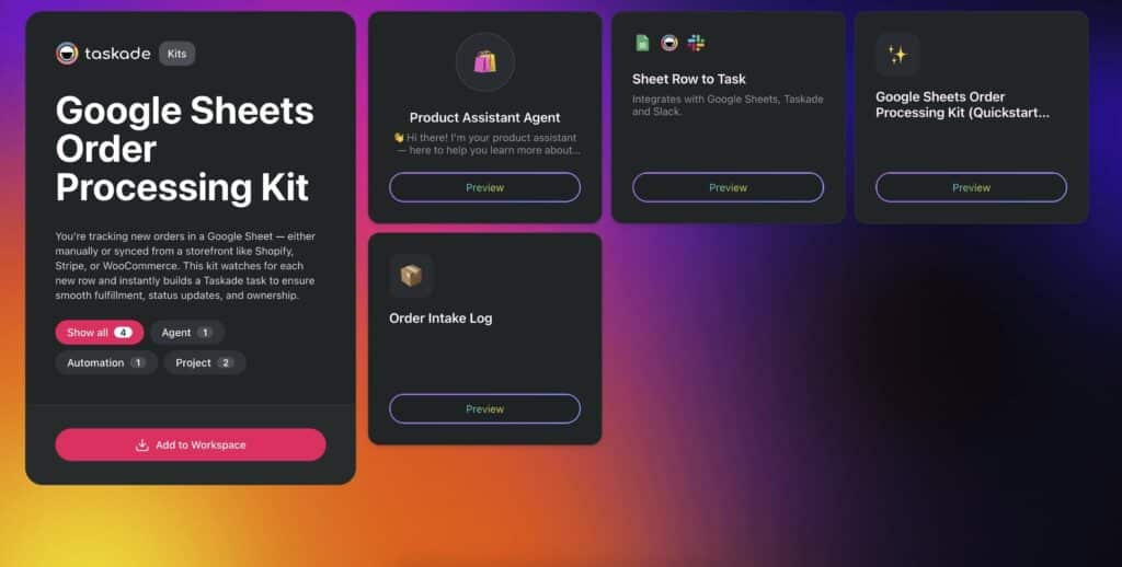 | 🛍️ Google Sheets Order Processing Kit | Pushes new customer orders from Google Sheets to Taskade. | Small ecommerce brands managing orders in Sheets |