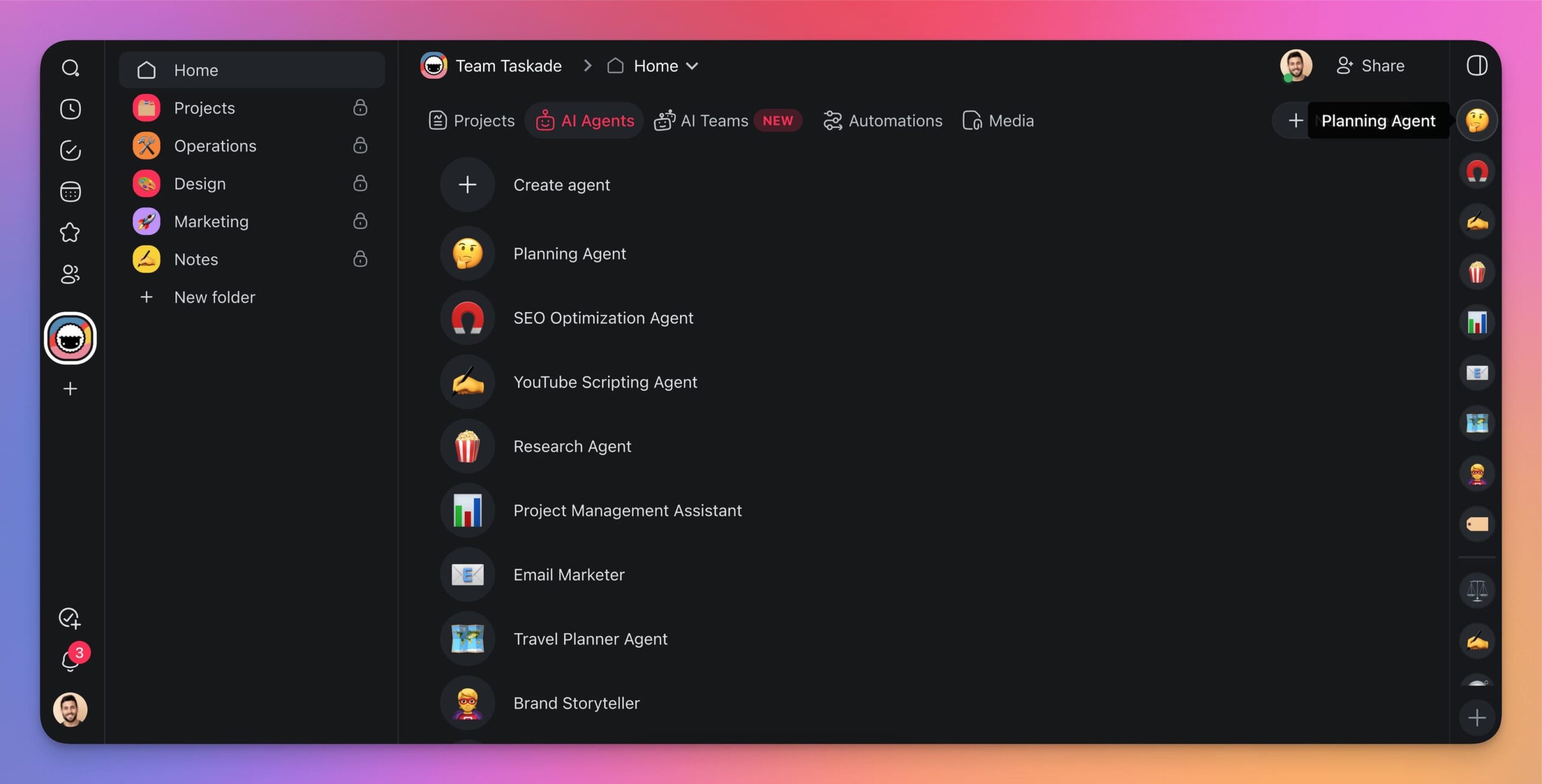 Each agent you create becomes a seamless part of your workflow. It works alongside you and your team, can interact with your projects and tasks, and naturally enhances collaboration.