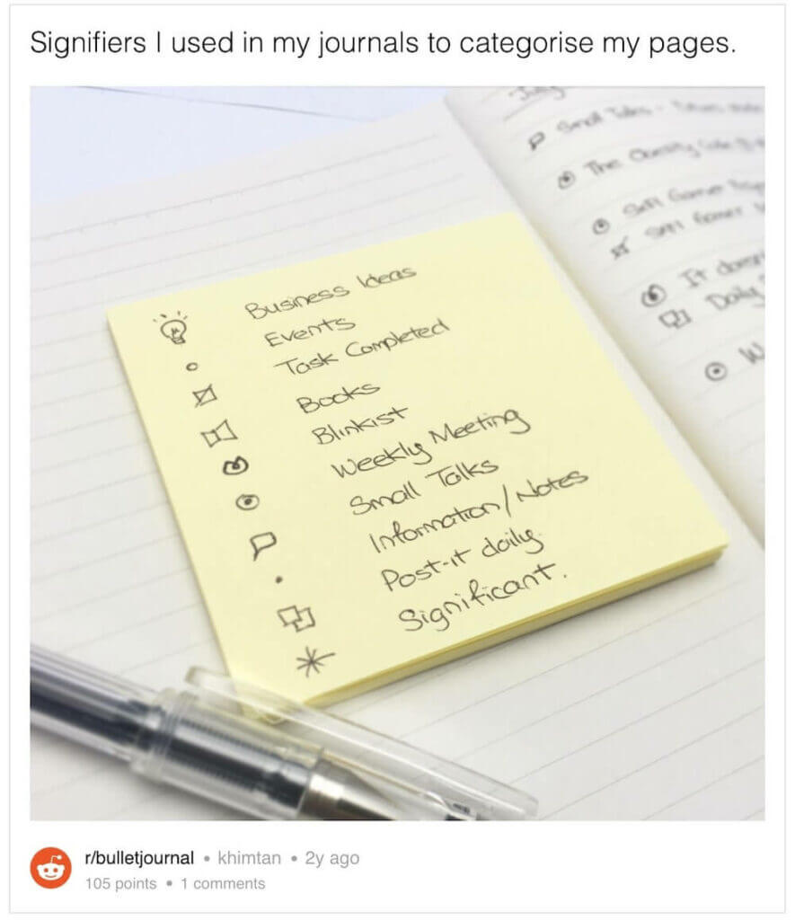 Of course, you don't want to copy quotes or entire passages verbatim. Rewriting in your own words (more on that in a bit) or using a shorthand-like system is much more effective. Bullet Journal signifiers are a perfect example of note-taking efficiency. 👇