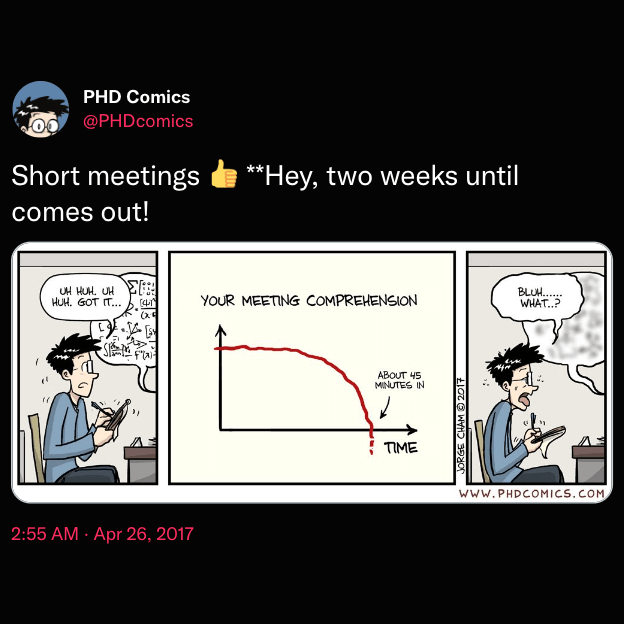 ⚡️ Make your meetings shorter: Did you know that most TED talks wrap under 18 minutes? The 18-minute rule applies to CEOs, scientists, motivational speakers, educators, and artists alike, so you can do it too.(9) The lesson for today? Turn your next meeting into a personal TED talk and finish before the 18-minute mark.