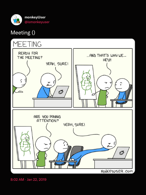 🤫 Have a day without meetings: A 2022 study of 76 companies with more than 1,000 employees found that at least one no-meeting day per week resulted in improved productivity, higher engagement, and… higher-quality discussions. You know what to do.(6)