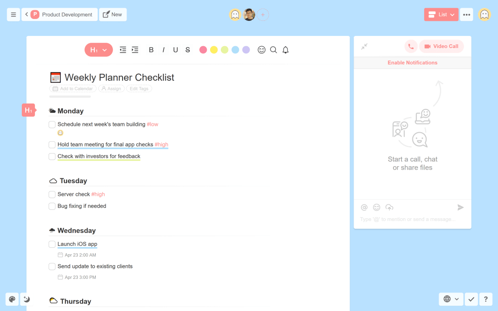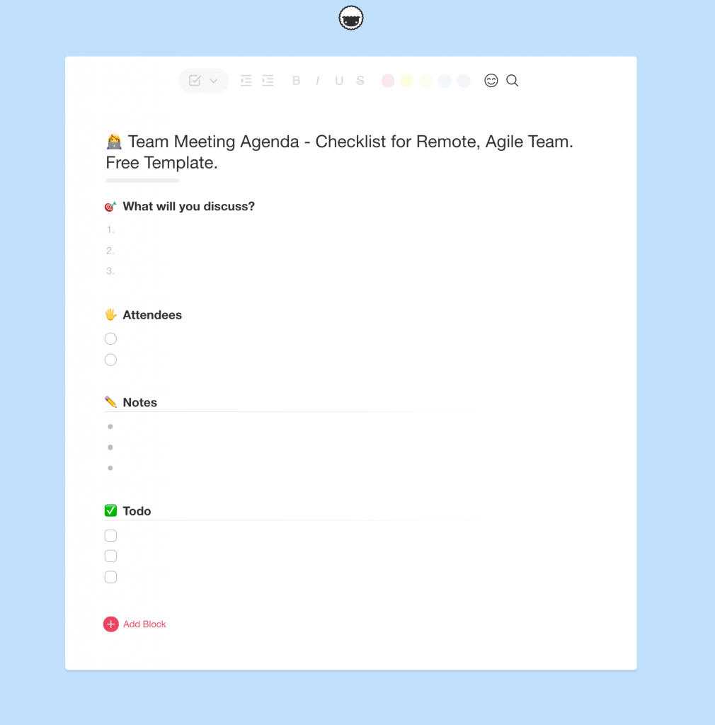 💡 Meeting organization tip: To avoid running hour-long video calls for every scheduled meeting, encourage your team to prepare bite-sized shownotes before joining in. With everybody up to speed on the agenda, it'd be easier to jump right in for the important stuff and dismiss the fleabites.