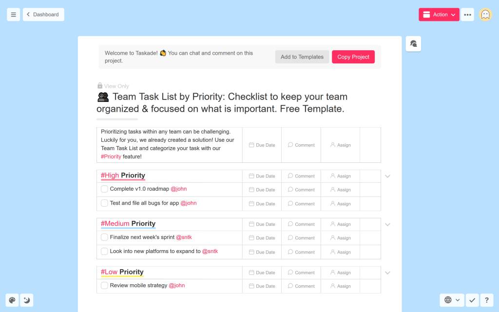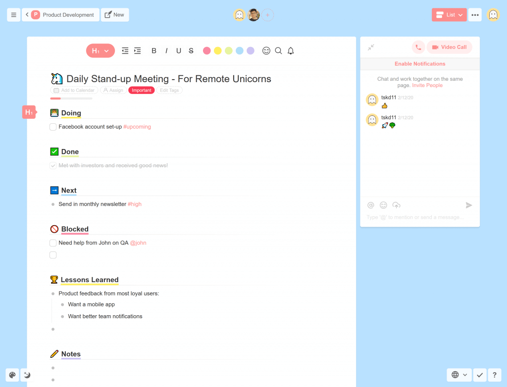 You can speed-up daily stand-ups by implementing simple checklists everybody can collaborate on in real time. Remember that for every list, document and note you create, Taskade lets you give video presentations and even share your screen 👨🏻💻🔛👩💻 so everybody can see the same thing.