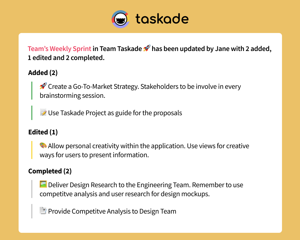 Your project update emails will now include all changes made by your team members. This includes added tasks, edited tasks, and completed tasks.