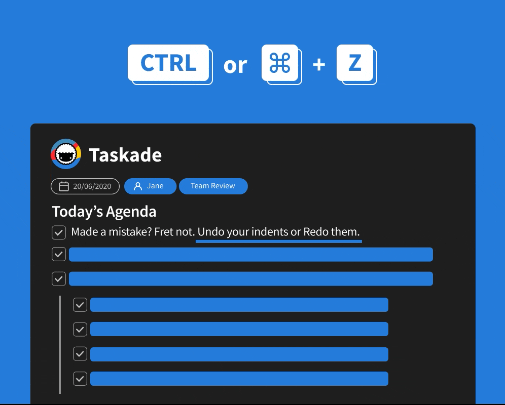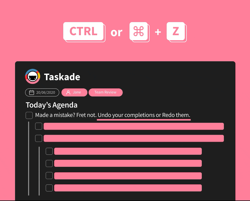 Taskade now supports Undo and Redo! Revert your changes safely while editing a project or collaborating with others on the same page.