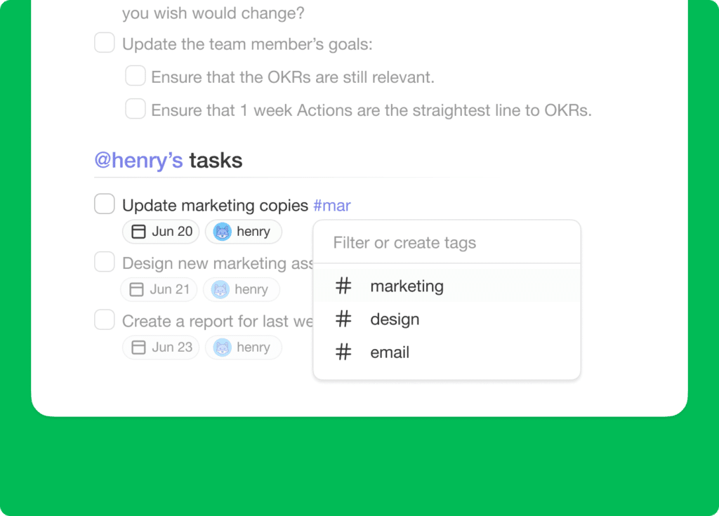 Tag management is here to help you organize and prioritize tasks! Simply type # to select from a list of previously used tags or create new ones on the spot!