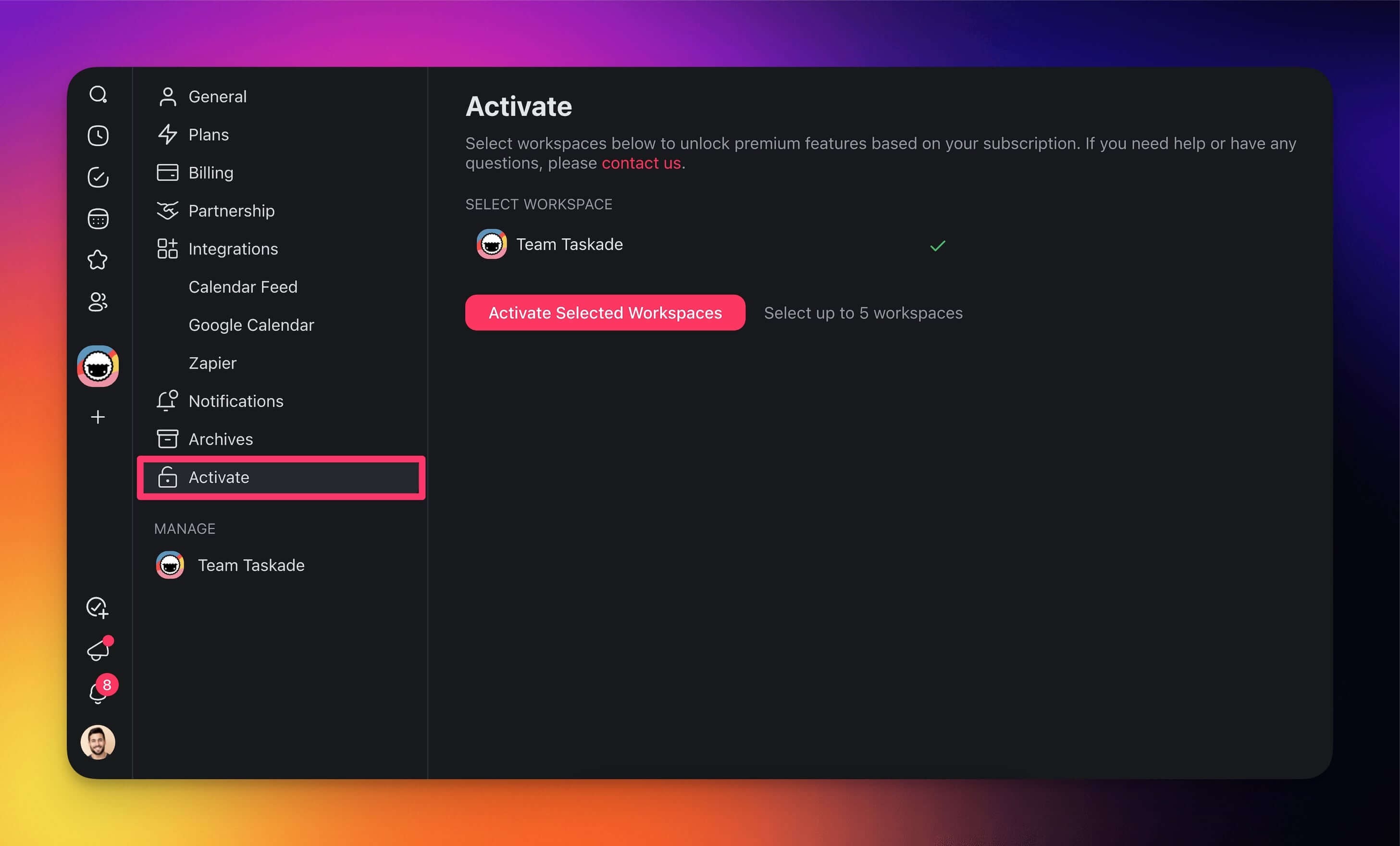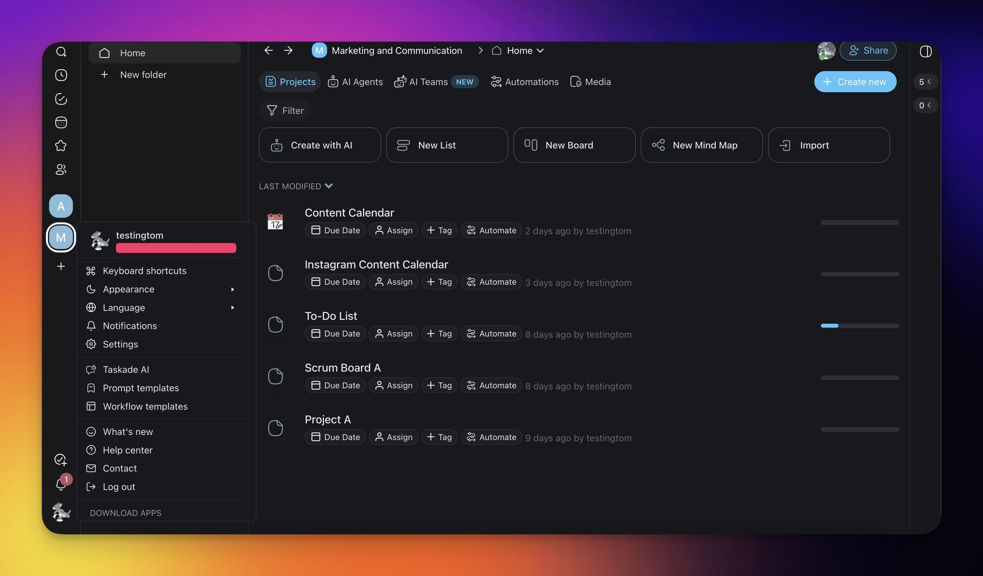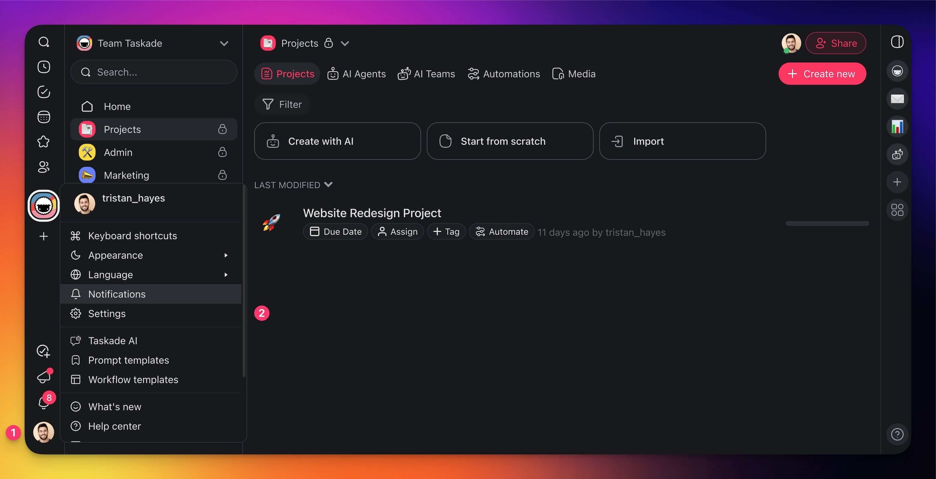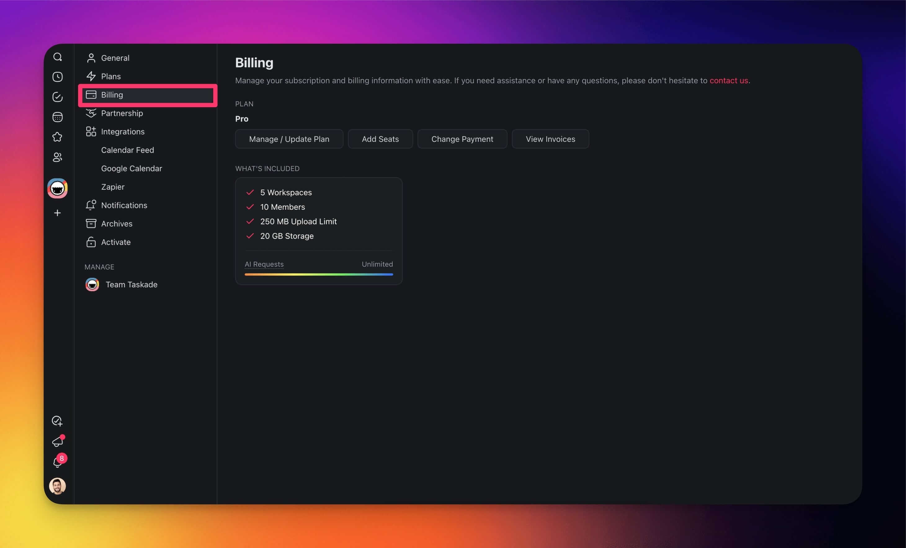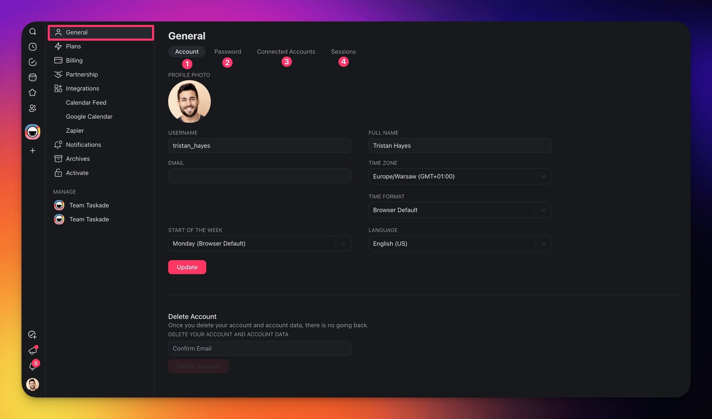 Account Settings allow you to customize your Taskade experience. Manage and adjust your personal details, preferences, and security options for your account.