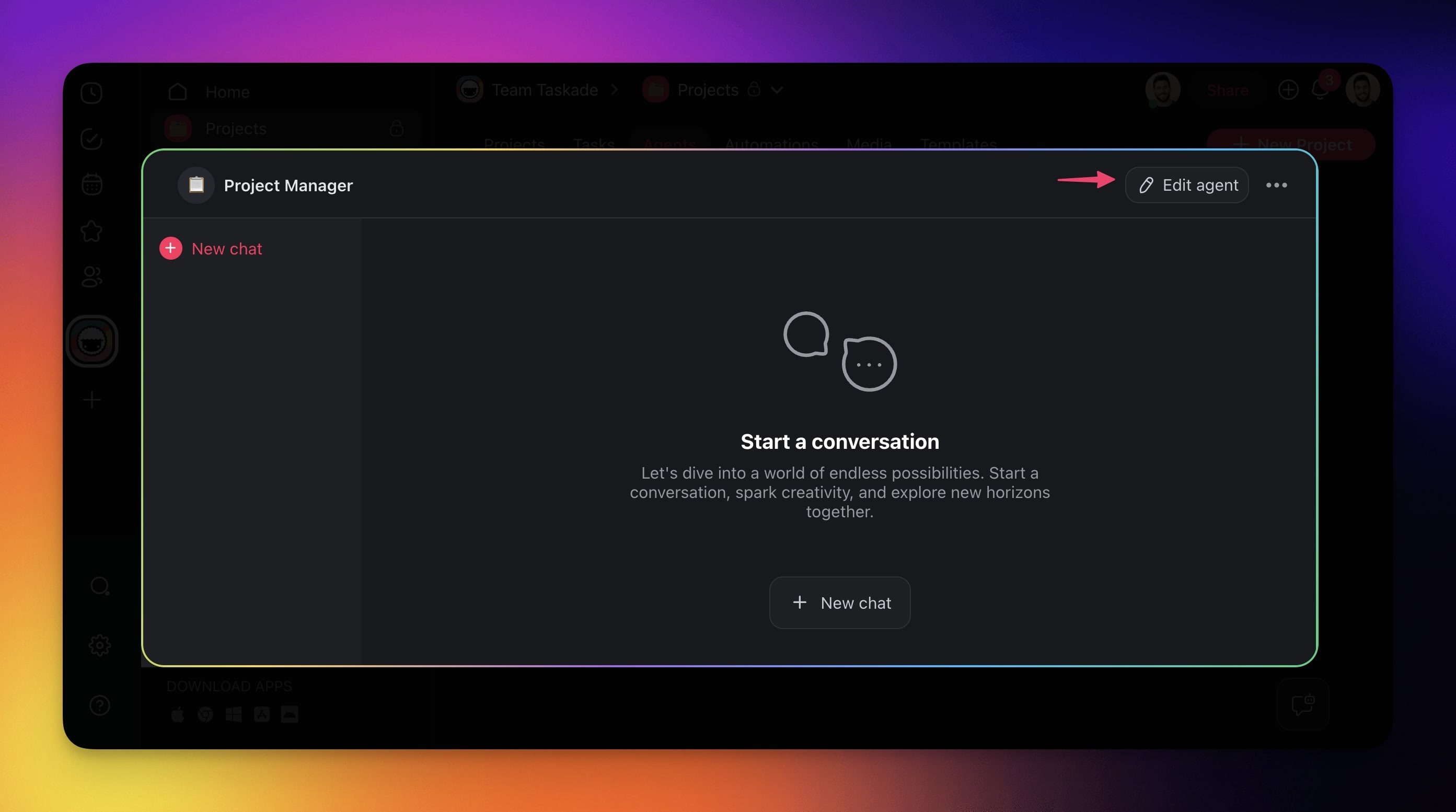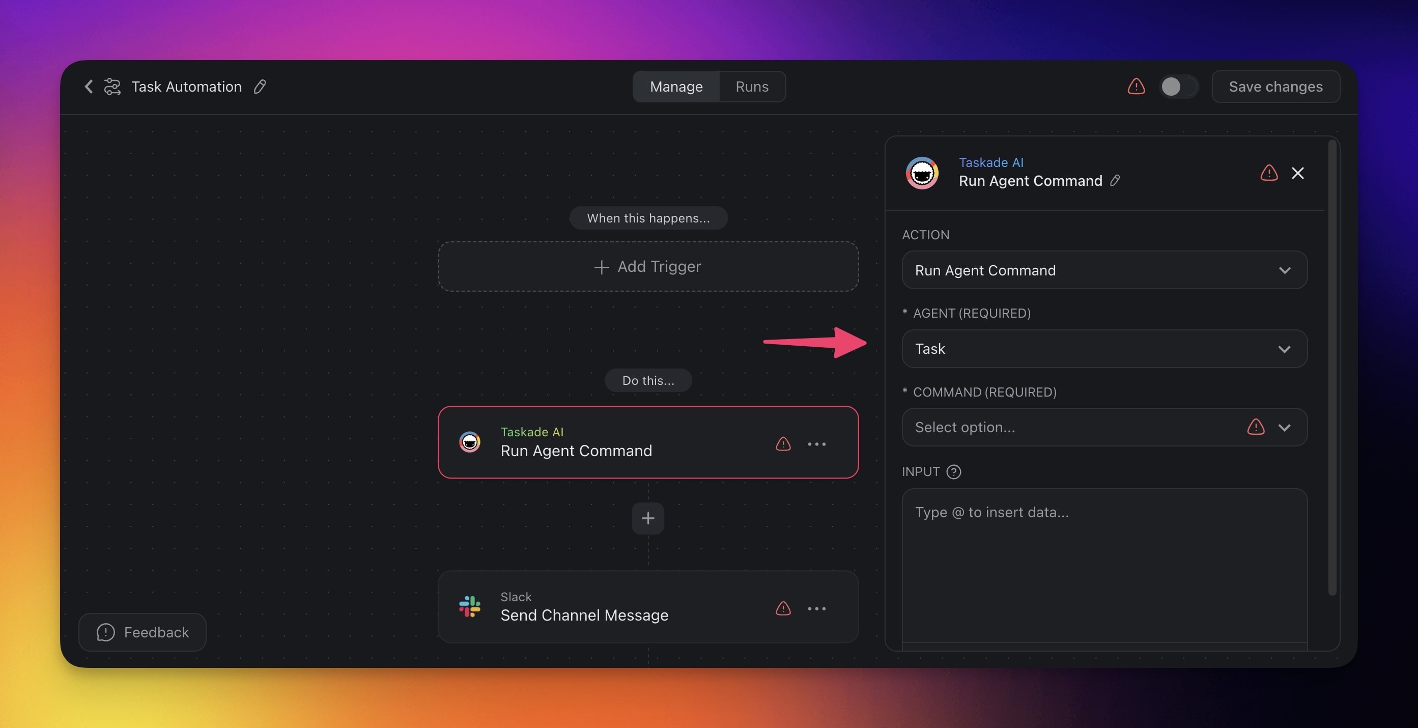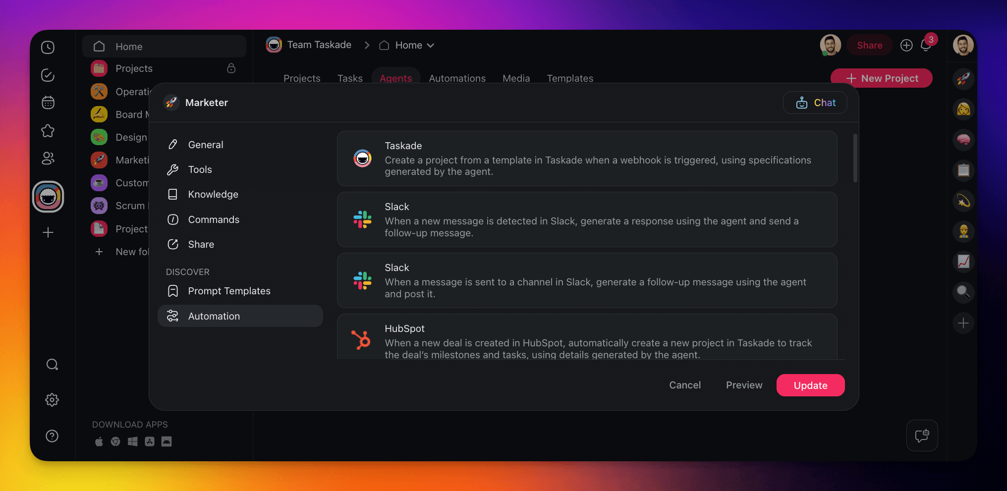Taskade EVE will configure the agent, enable the right tools, and connect the automation actions โ all in one step.