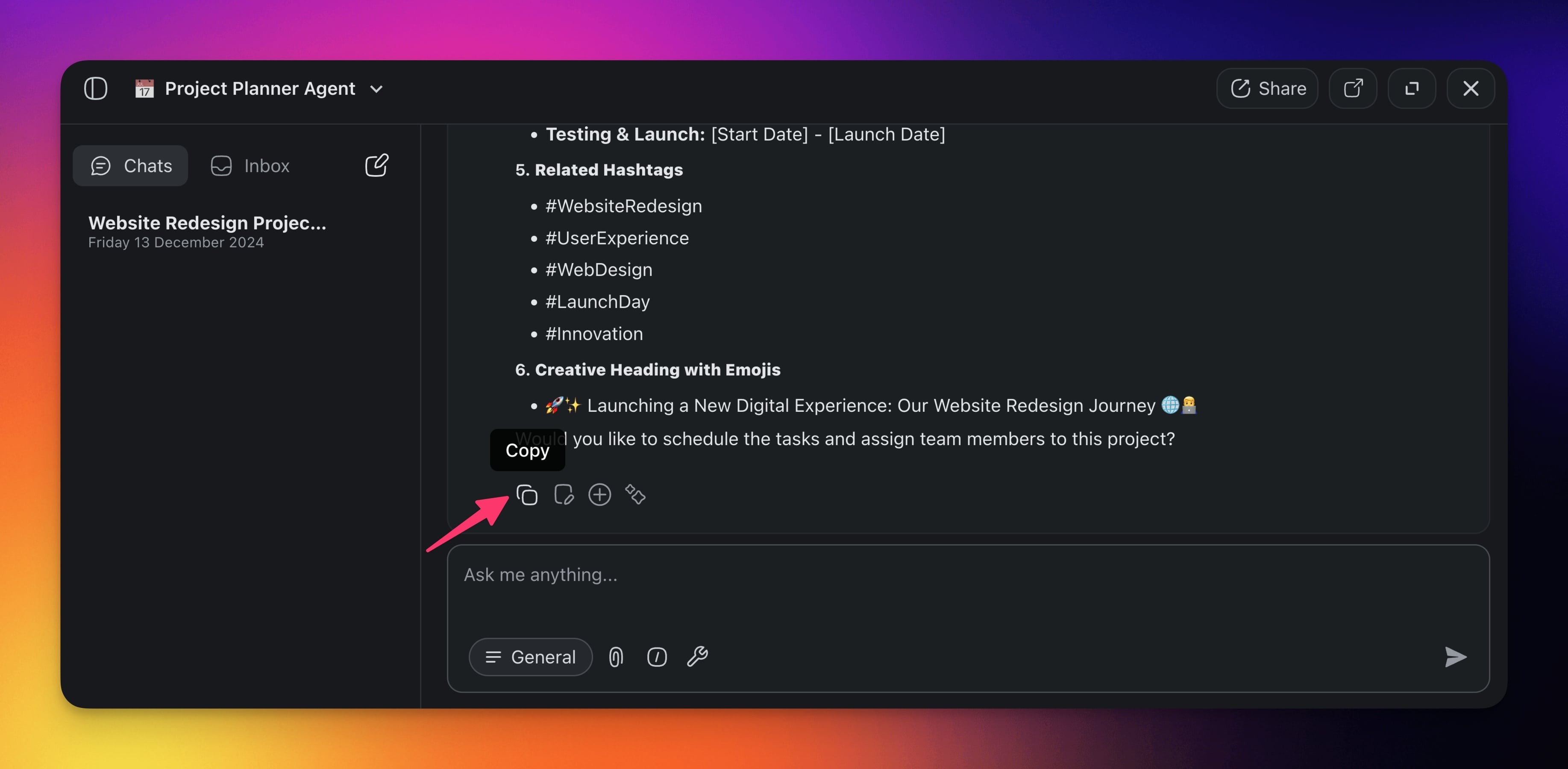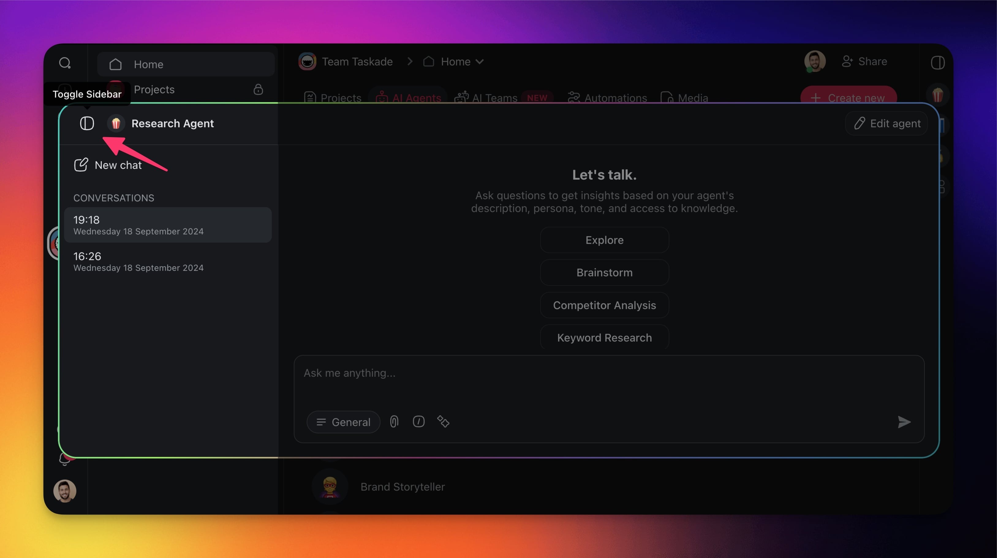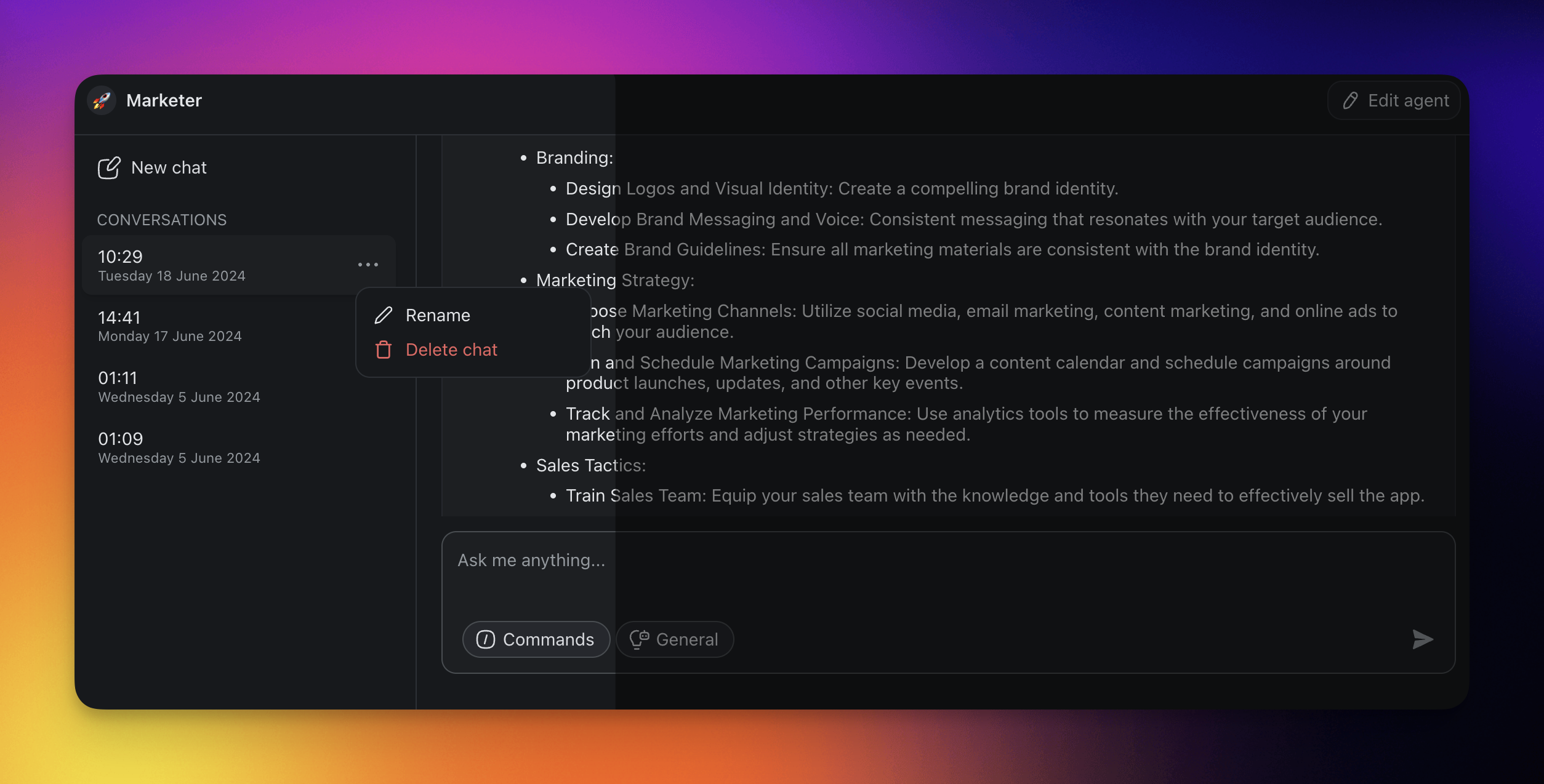 - Focused conversations: Keep multiple chat threads with the same AI agent neatly organized, each tailored for specific topics or projects.
