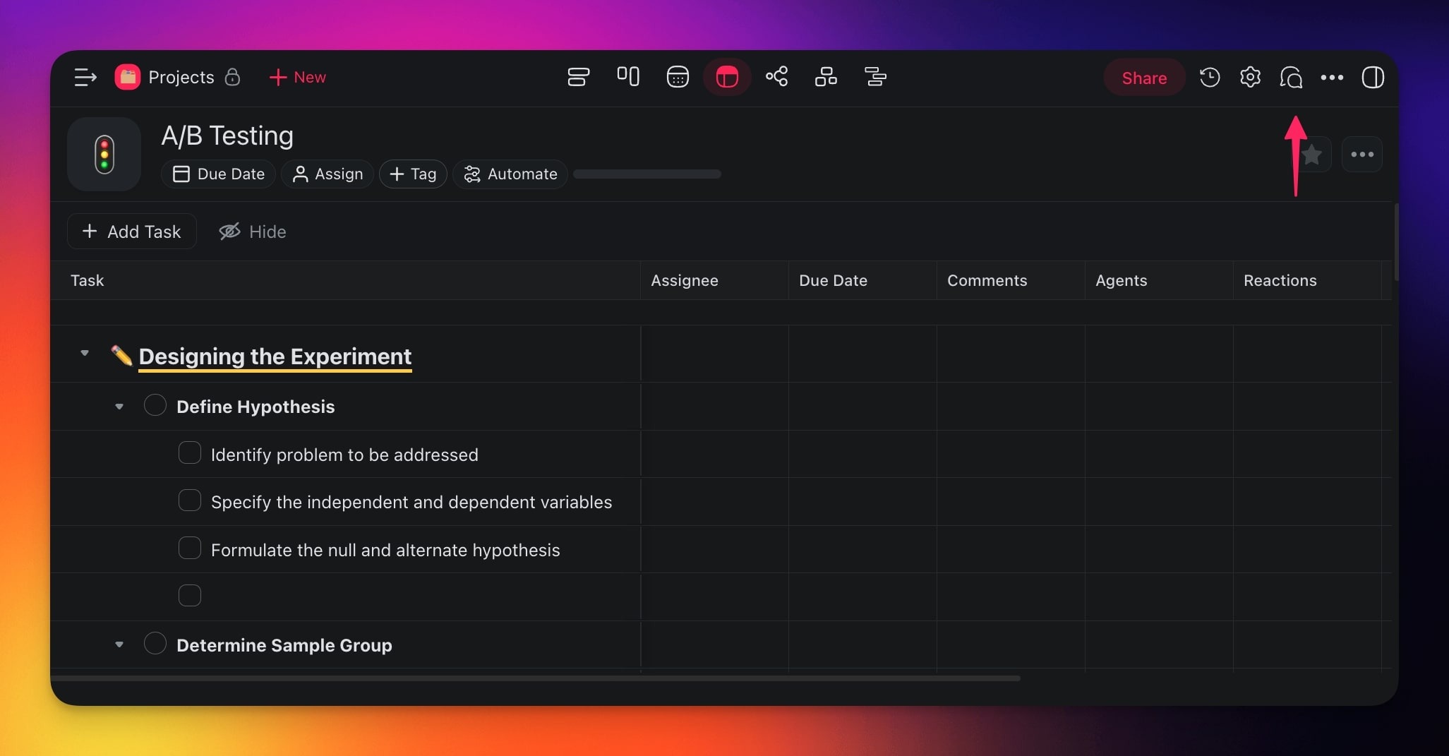 - Open a project and click the chat balloon icon ๐ฌ (top-right).