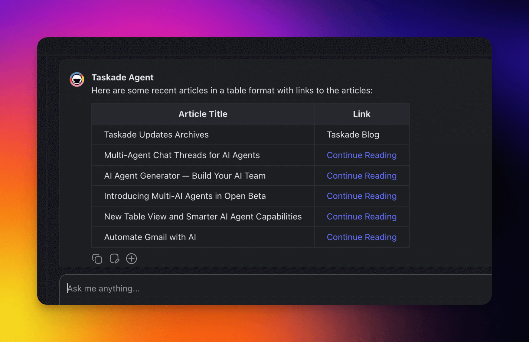 Agents can render data in table format to make it easier to read and analyze. This is useful for organizing information in reports, comparisons, and schedules.