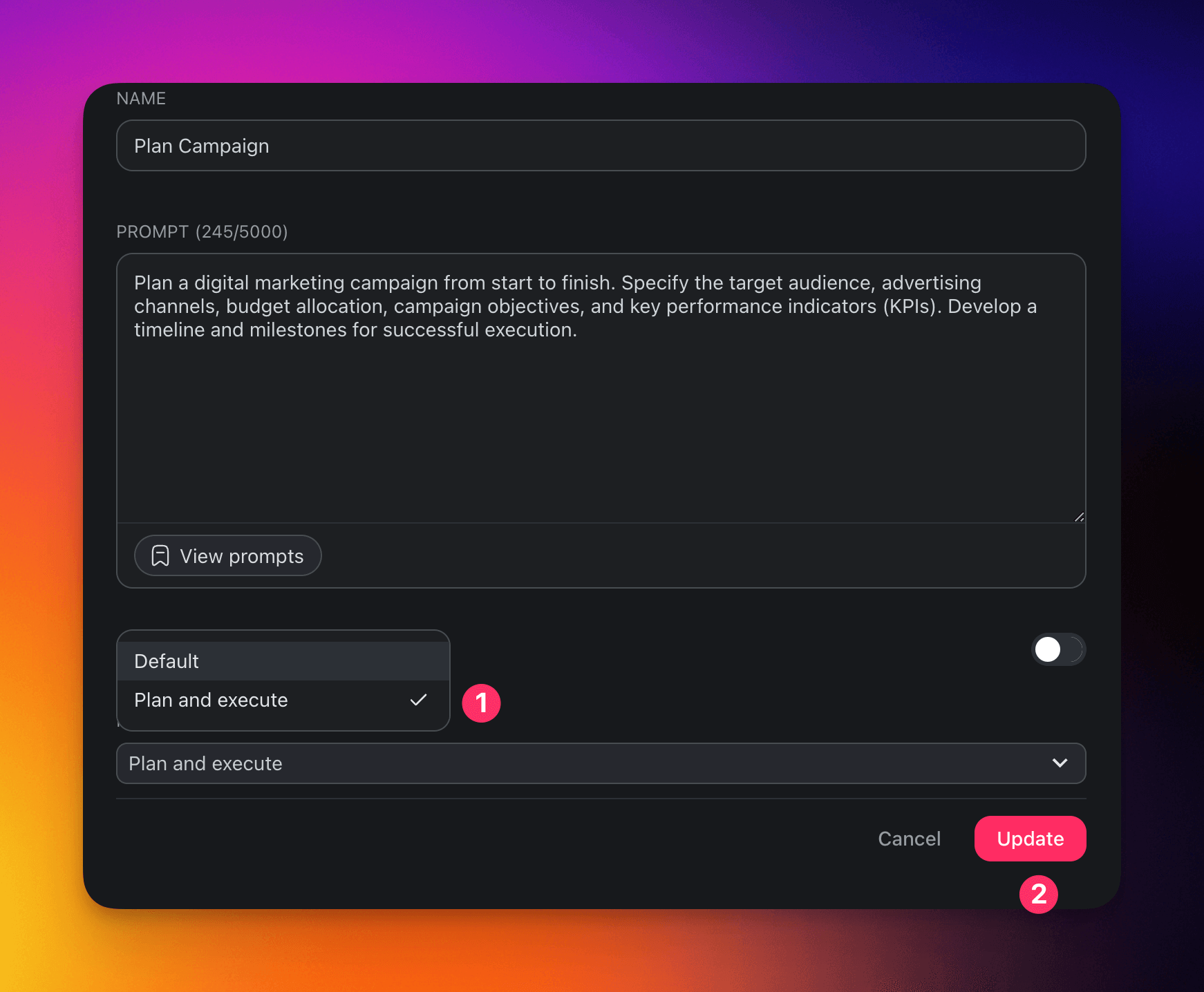 Command modes dictate how your custom AI agents approach tasks, whether by following specific instructions or by autonomously setting goals and iteratively working towards them. Currently, there are two primary modes: