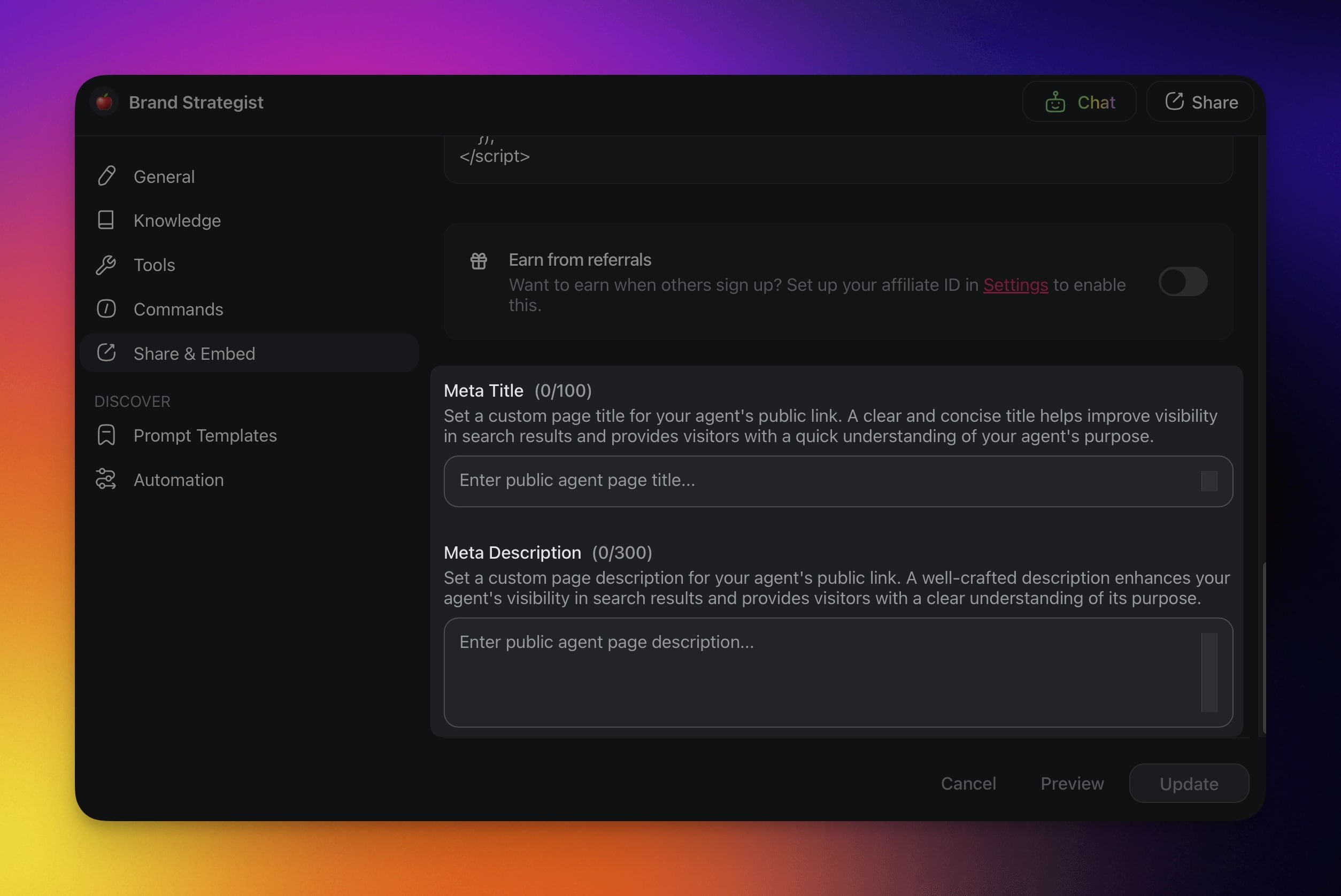 To enhance visibility and search engine optimization (SEO) for your public agent, you its customize the meta title and description. These fields help provide a clear, concise summary of your agentโs purpose in search results.Steps to Customize: