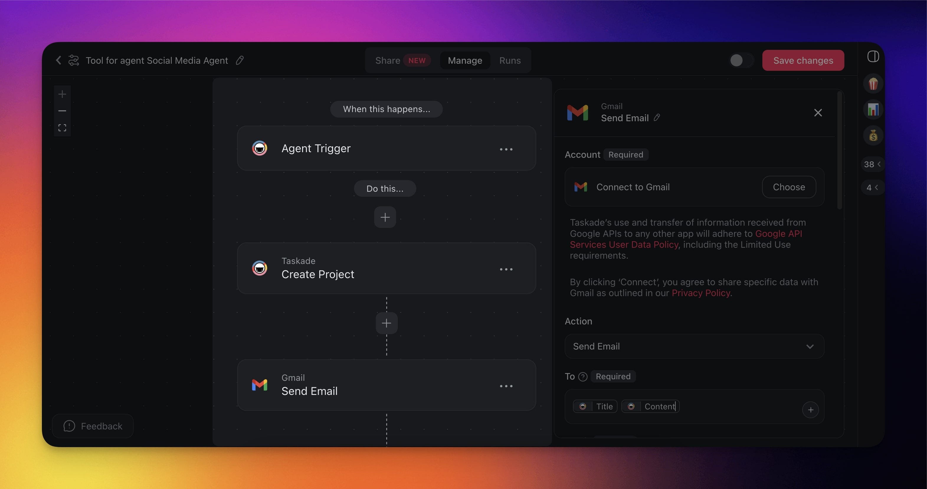 Every time your agent attempts to interact with an external platform, e.g., to send an email via Gmail, you'll need to approve the action before any data is exchanged. This security mechanism ensures that no actions are taken without your explicit consent.