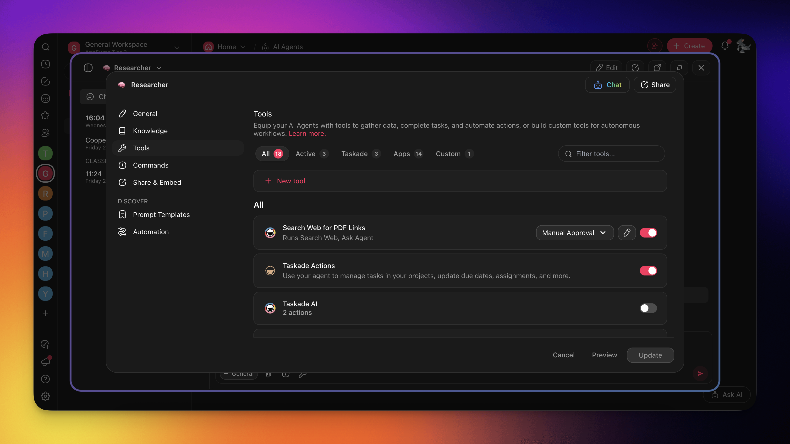Taskade EVE vs Custom Agents: Taskade EVE has access to all 26 built-in tools and can use any tool immediately. Custom AI agents need tools manually enabled โ go to the agent's settings and toggle on the tools you want it to use.