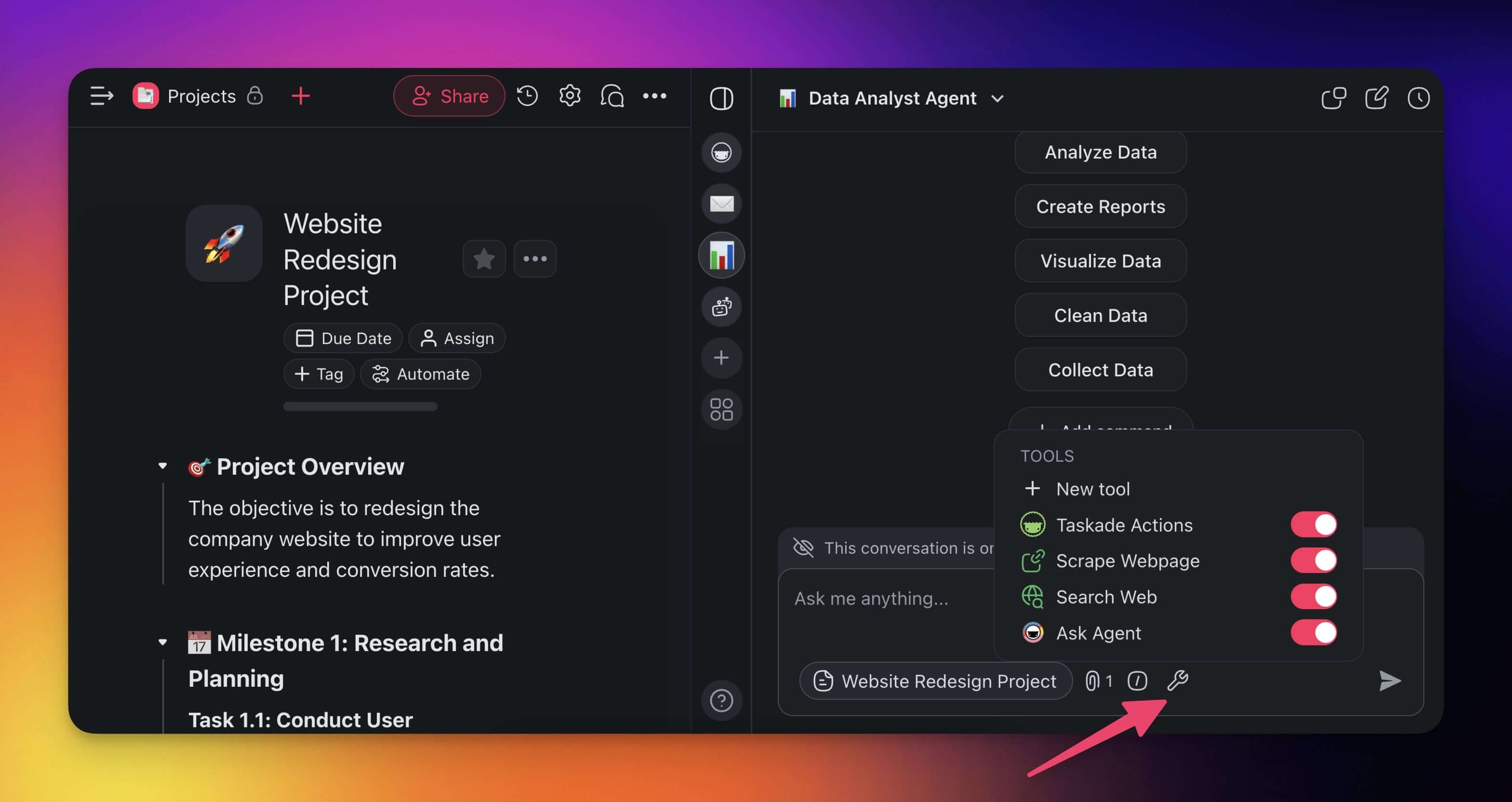 Use the agent to automatically create projects and tasks in your workspace.
