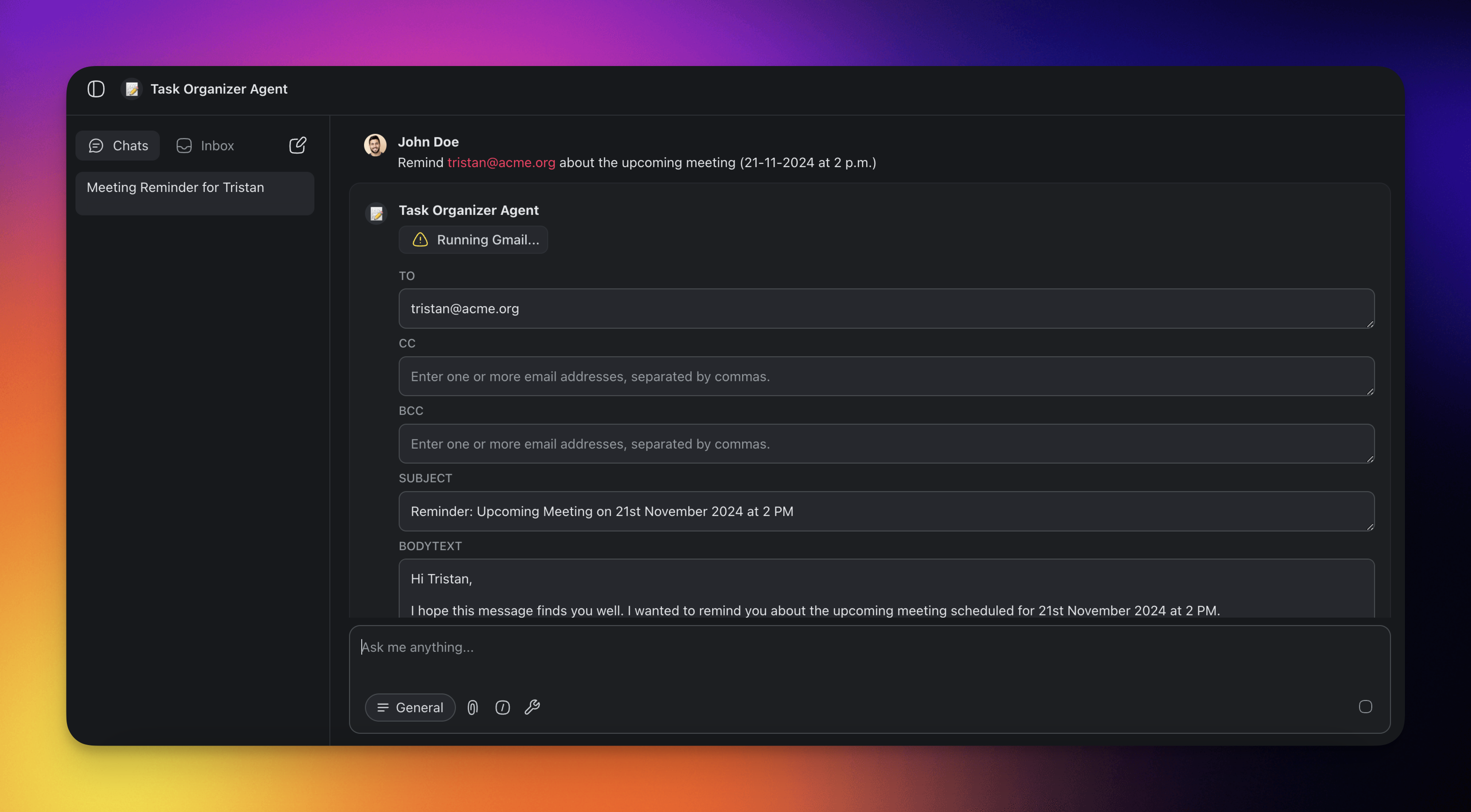 - Prompt the agent to carry out a task, e.g. "Please send the document you just generated to [email protected] via Gmail."