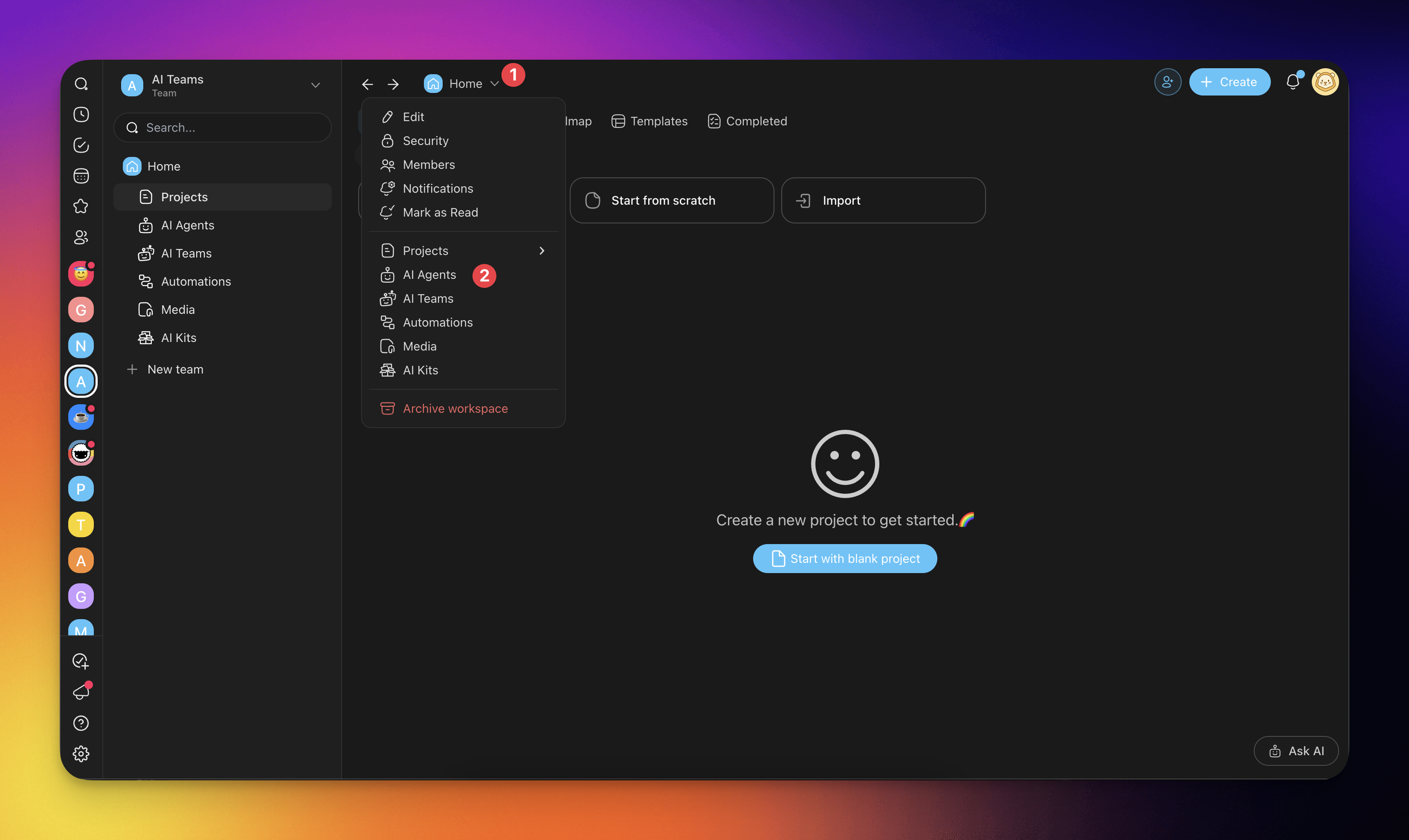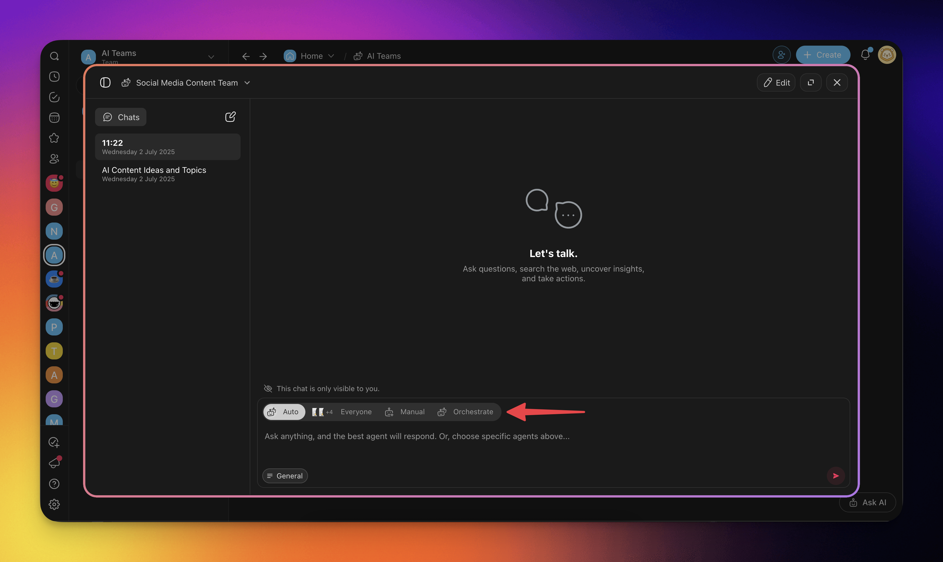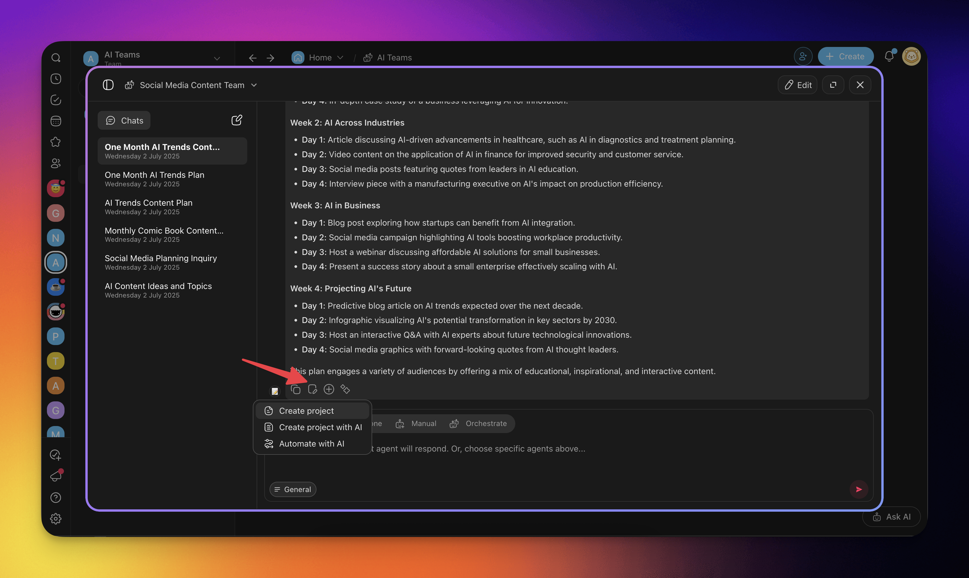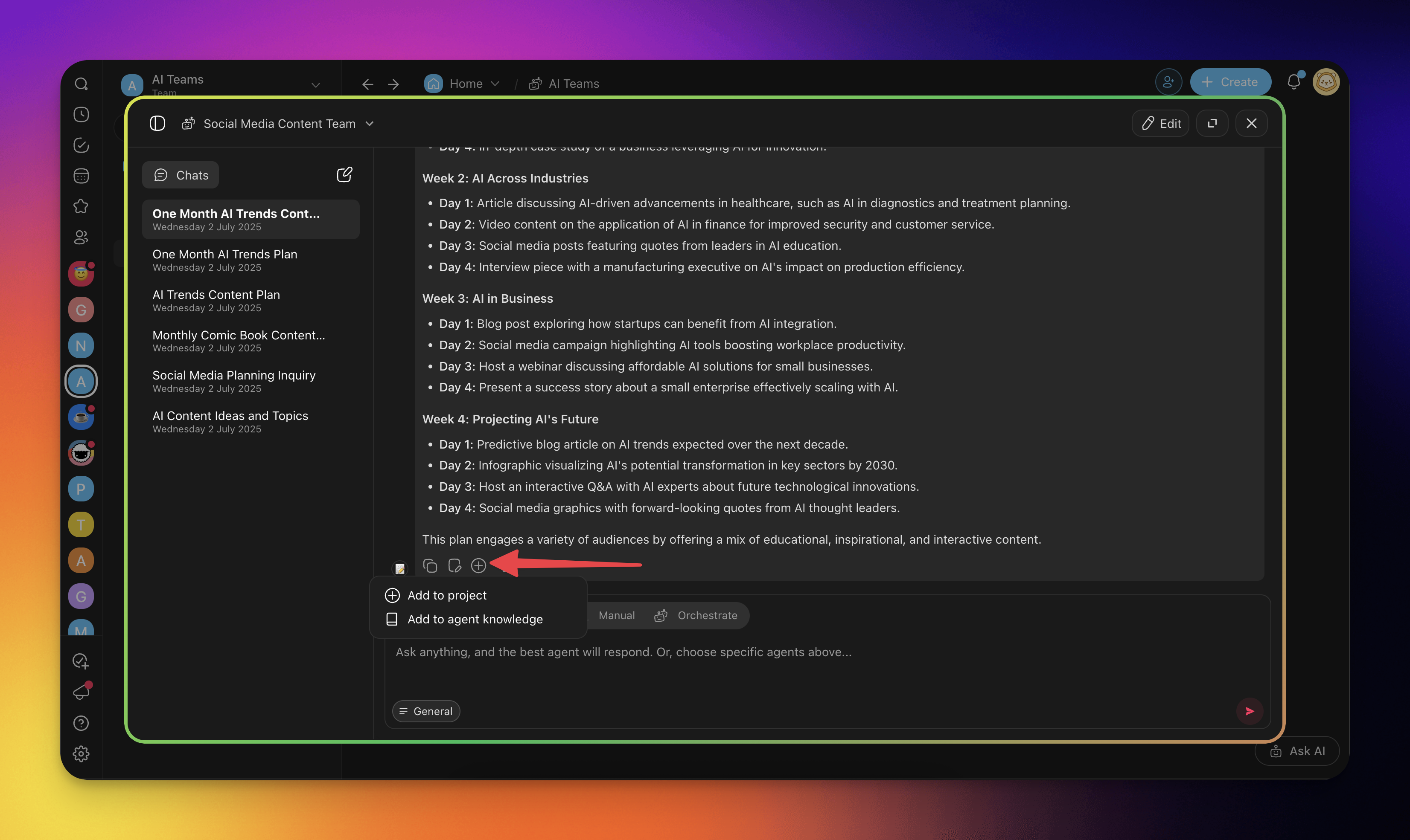 💡 Note: AI Team chat supports project context, which means that you can talk to your AI team about the project you're looking at.