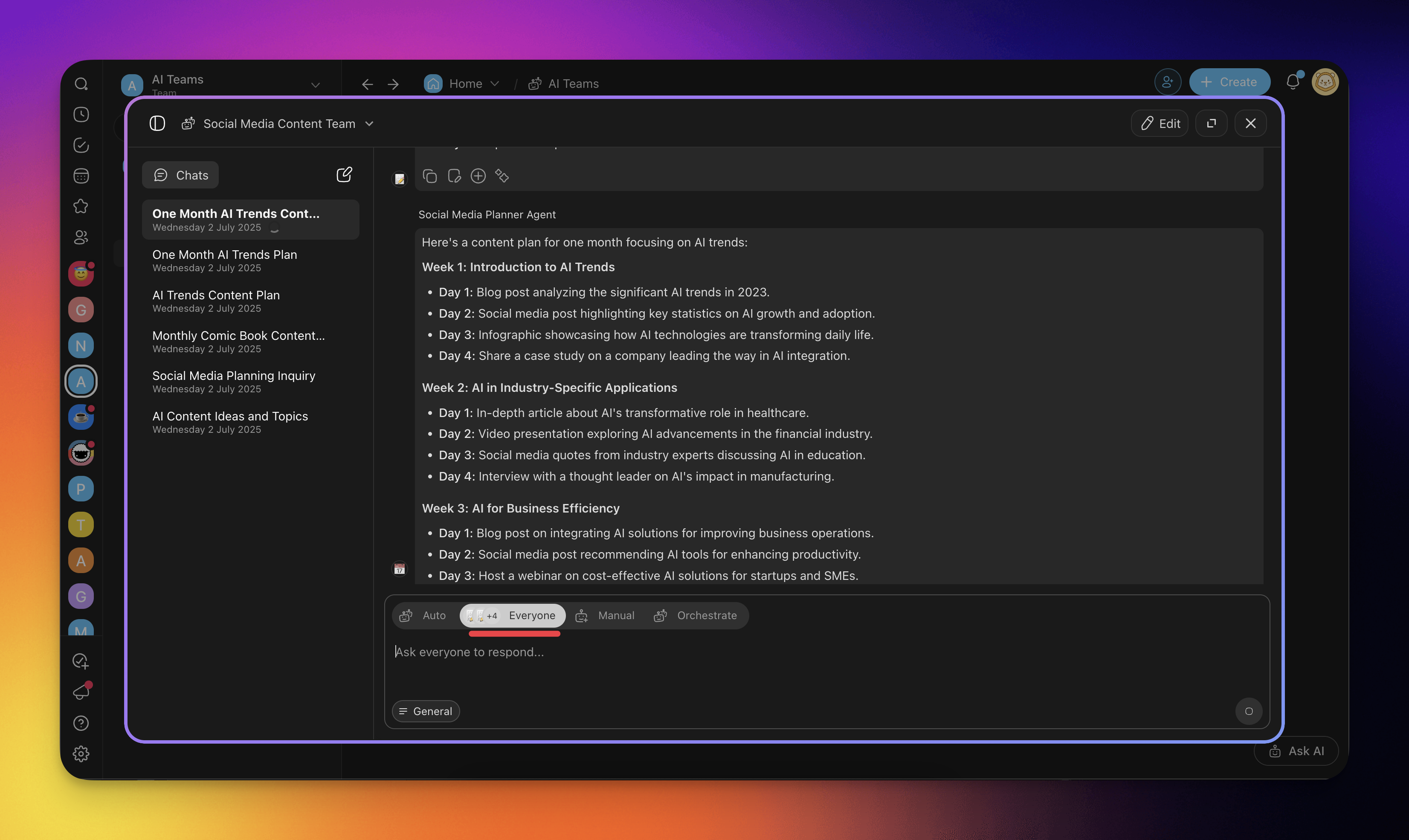 Interacting with your team is similar to interacting with individual agents, with the key difference being that all AI team members are aware of the conversation.