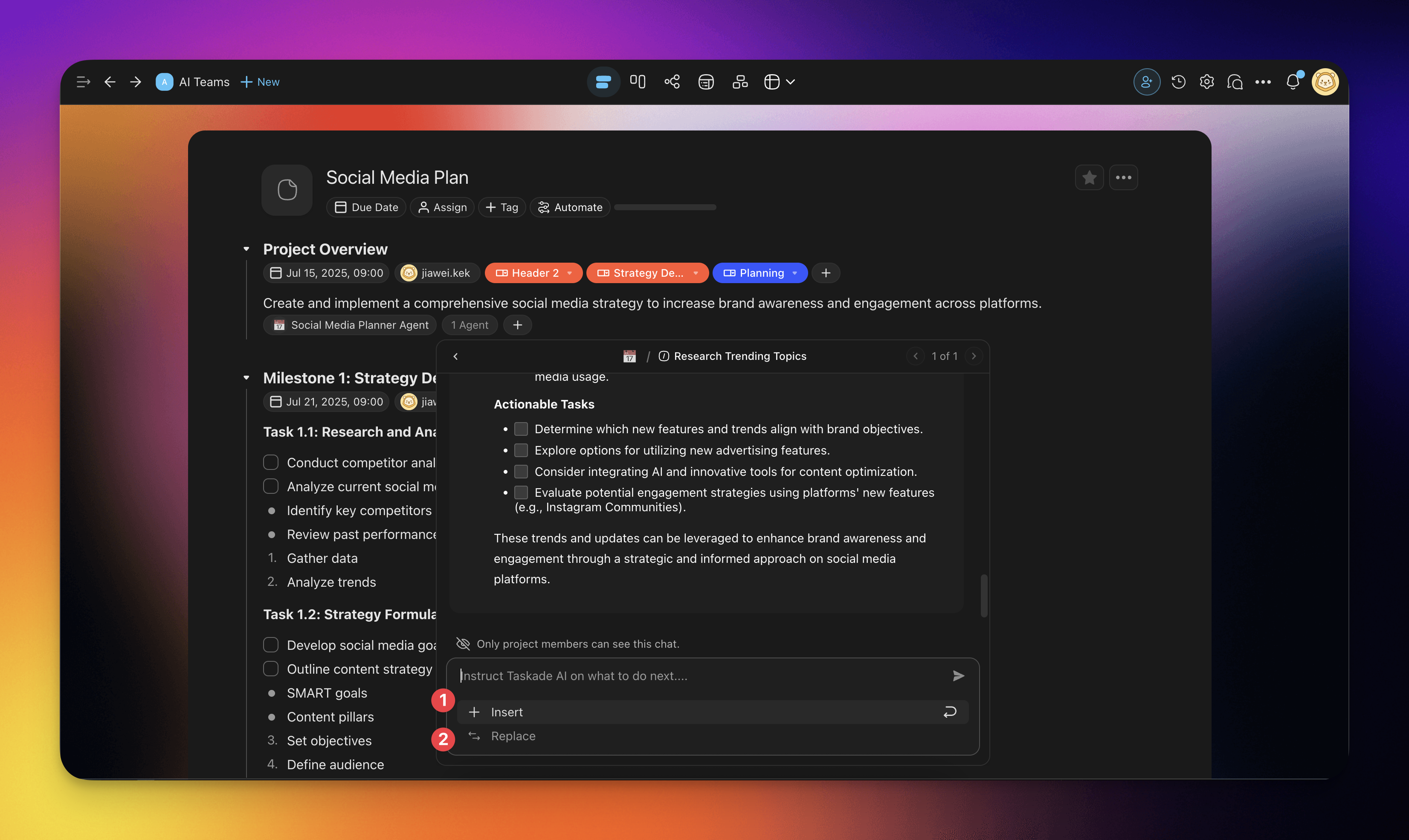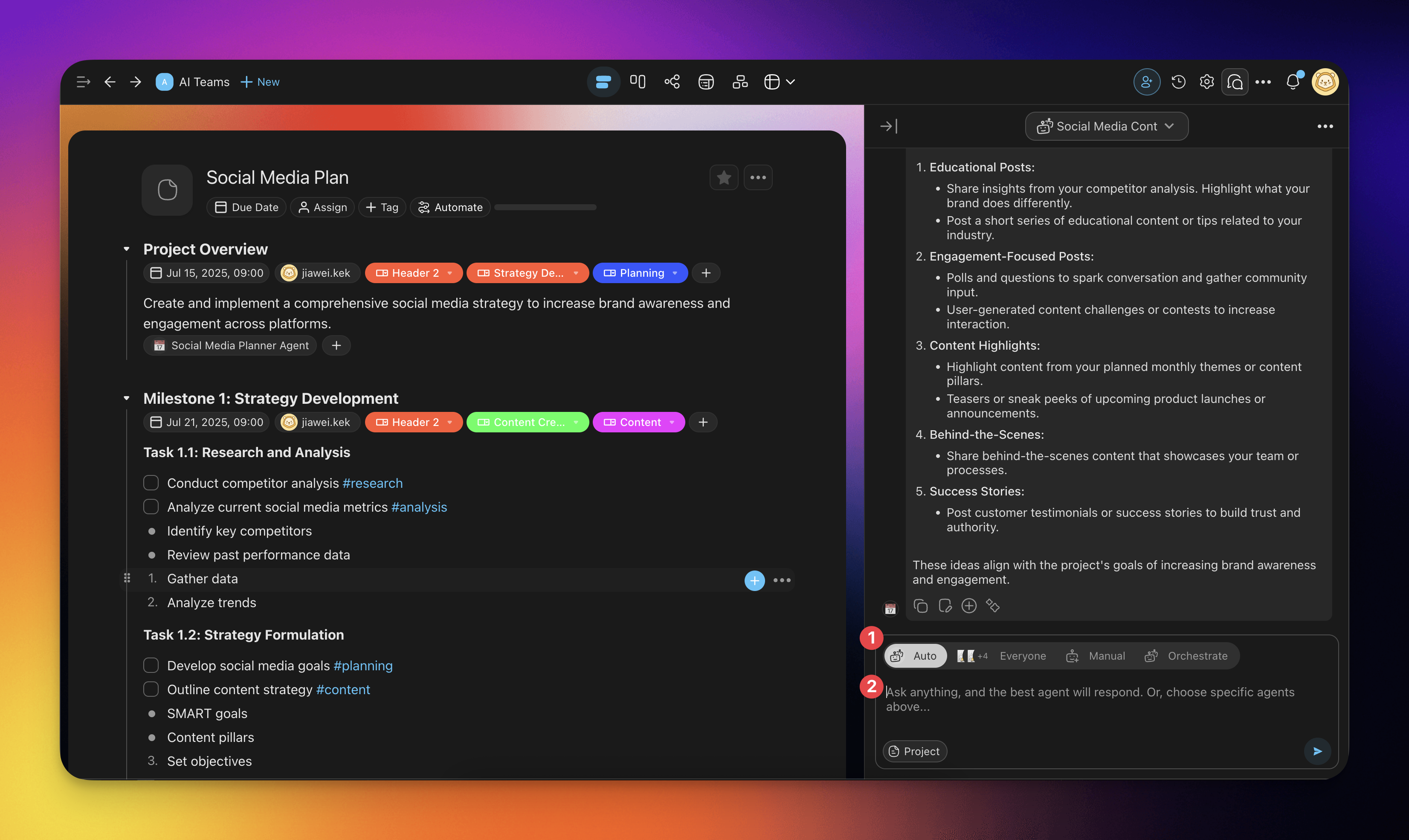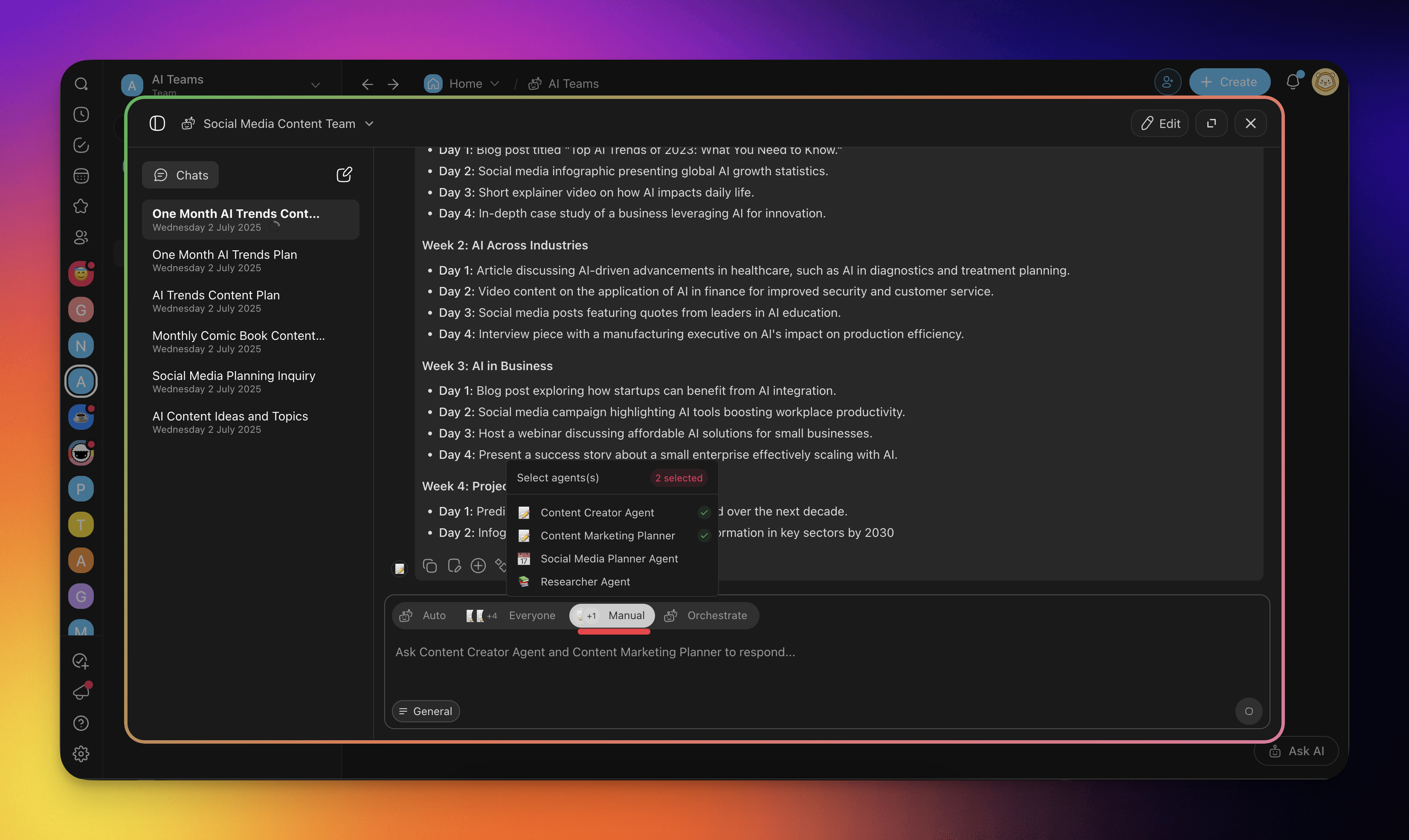 Taskade AI will automatically choose the most suitable agent(s) based on the prompt.