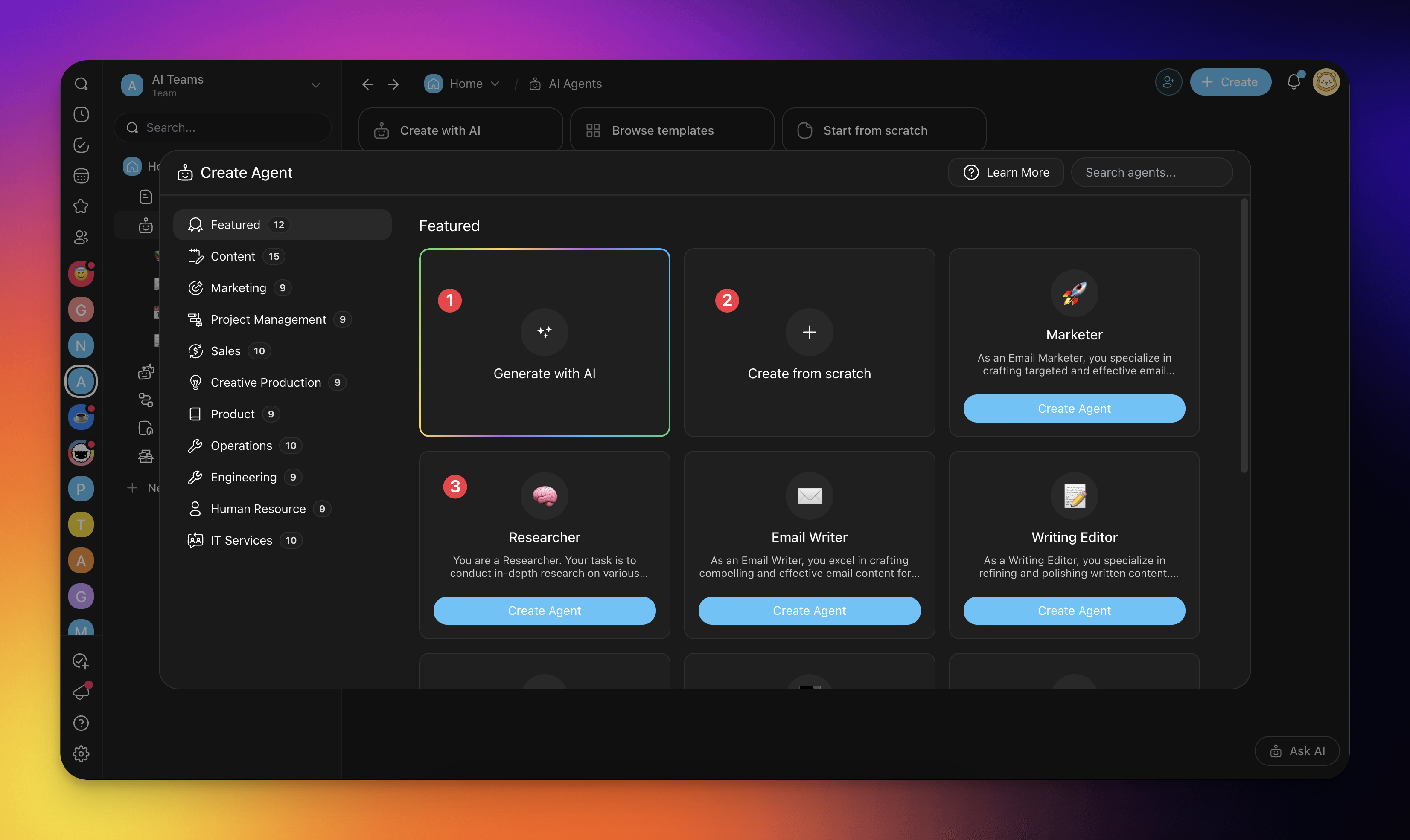 An AI Team is a group of AI agents designed to work together seamlessly. When you create an AI Team, you can collaborate with all the agents simultaneously and leverage their collective expertise. In a team, the agents automatically select the most qualified member to respond to ensure you receive the best possible answer.