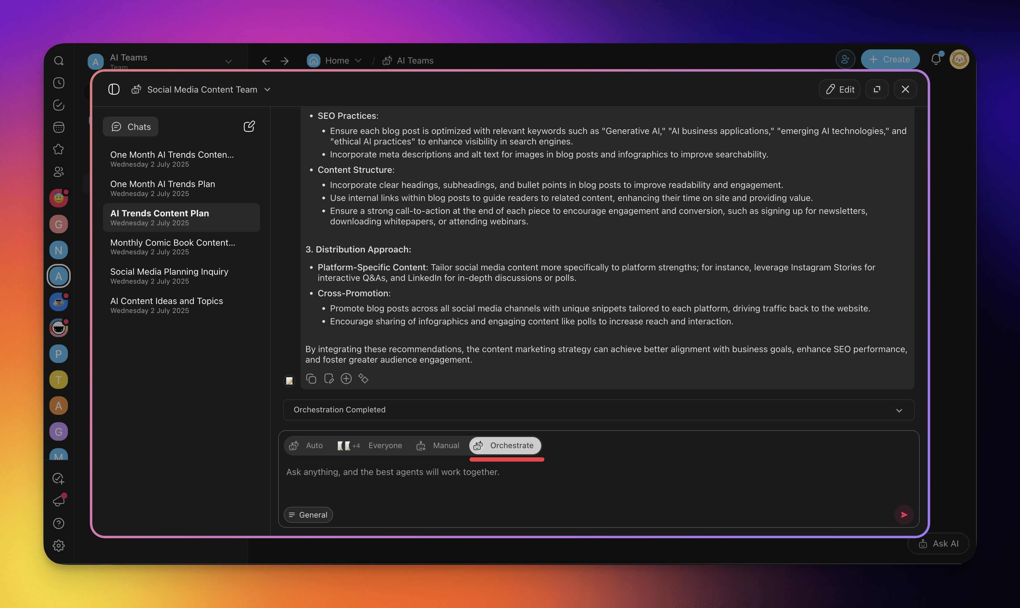 💡 Note: In a team setting, agents build on each other’s responses and, depending on the tools you have configured, perform actions on your behalf.