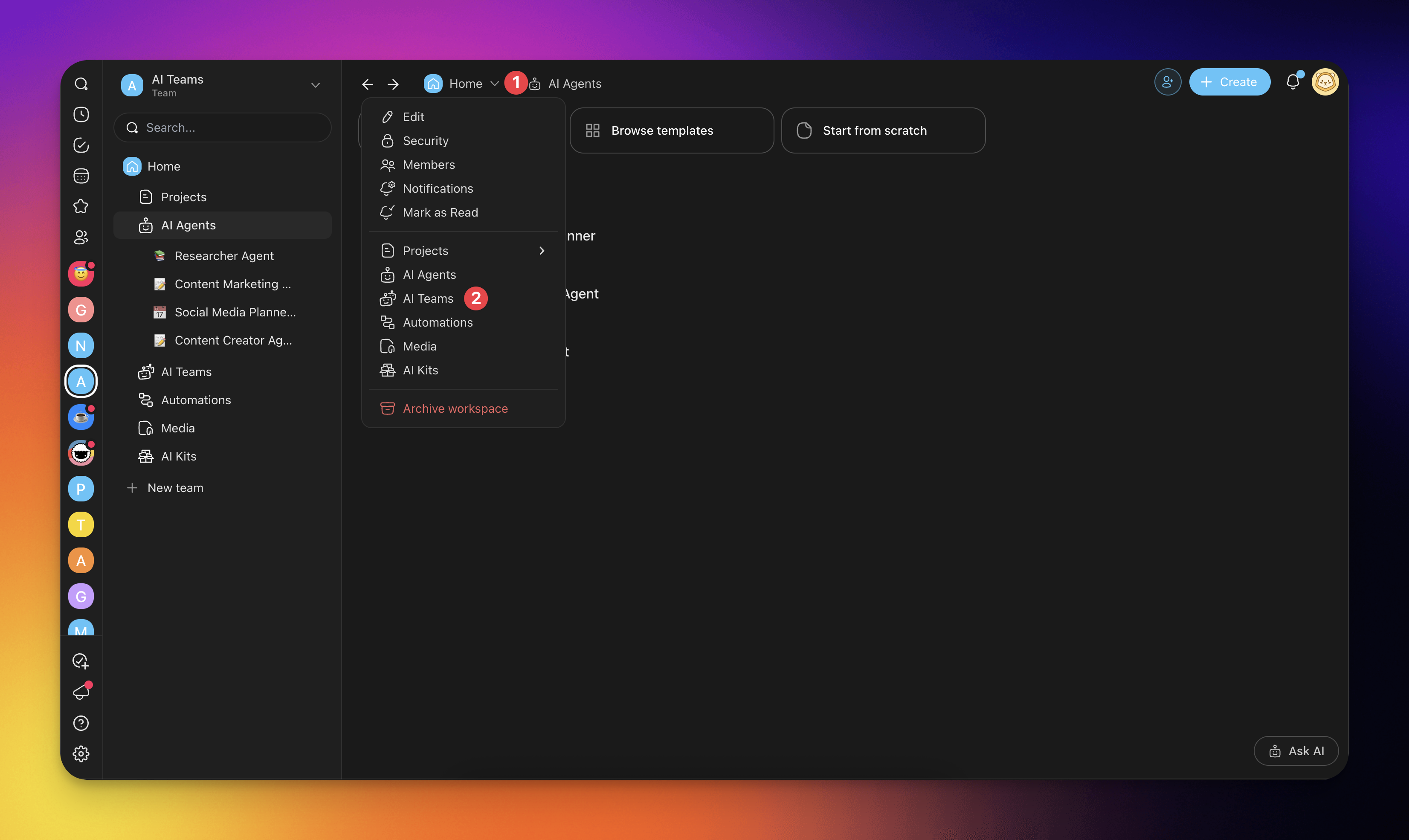 - Go to the AI Teams tab at the top of your workspace or folder.