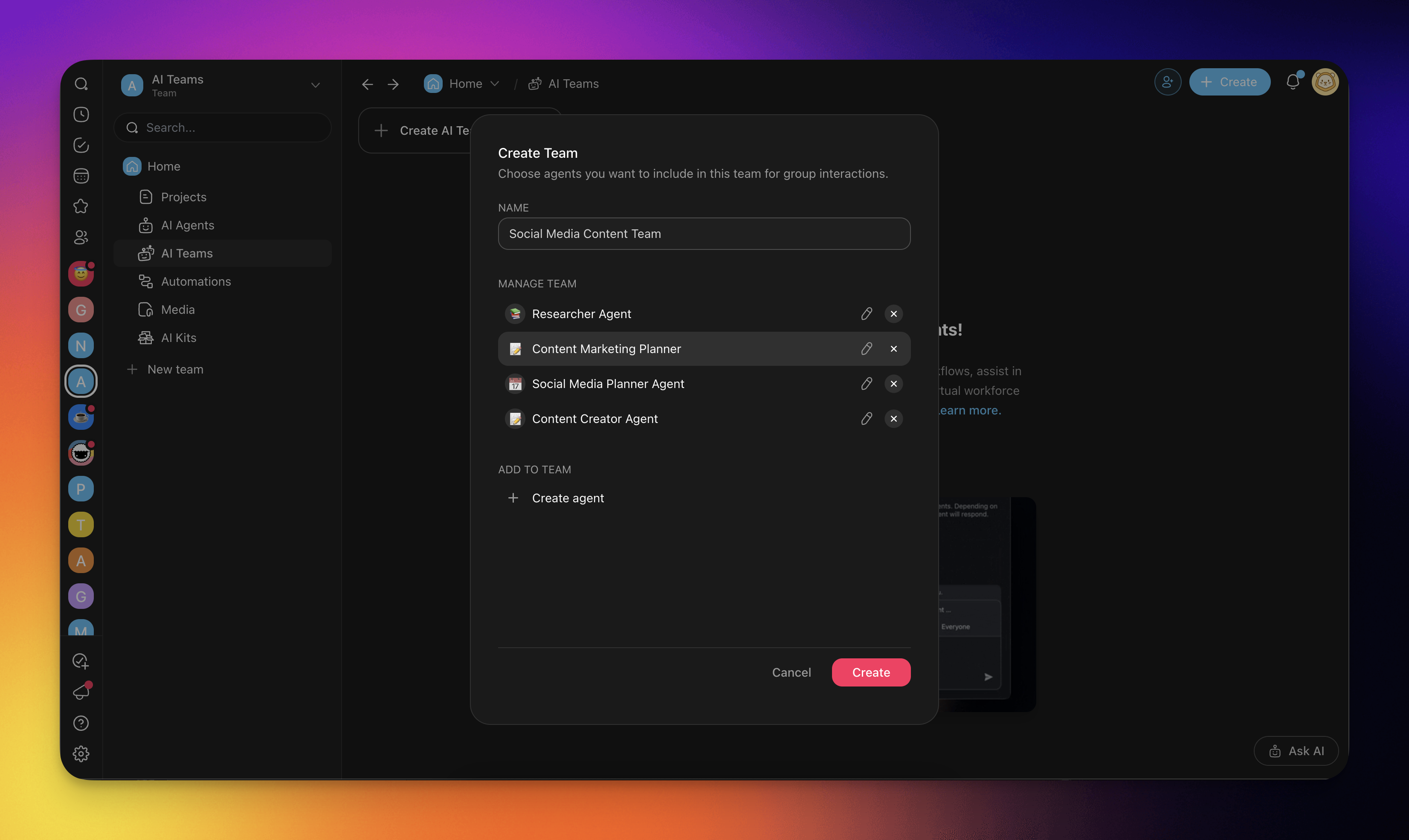 The AI Team Generator lets you create entire multi-agent teams with a single prompt.