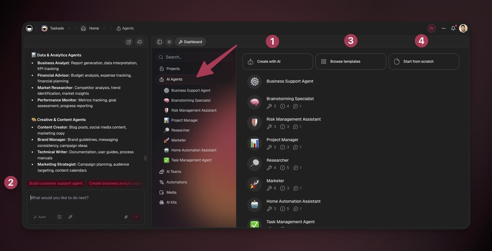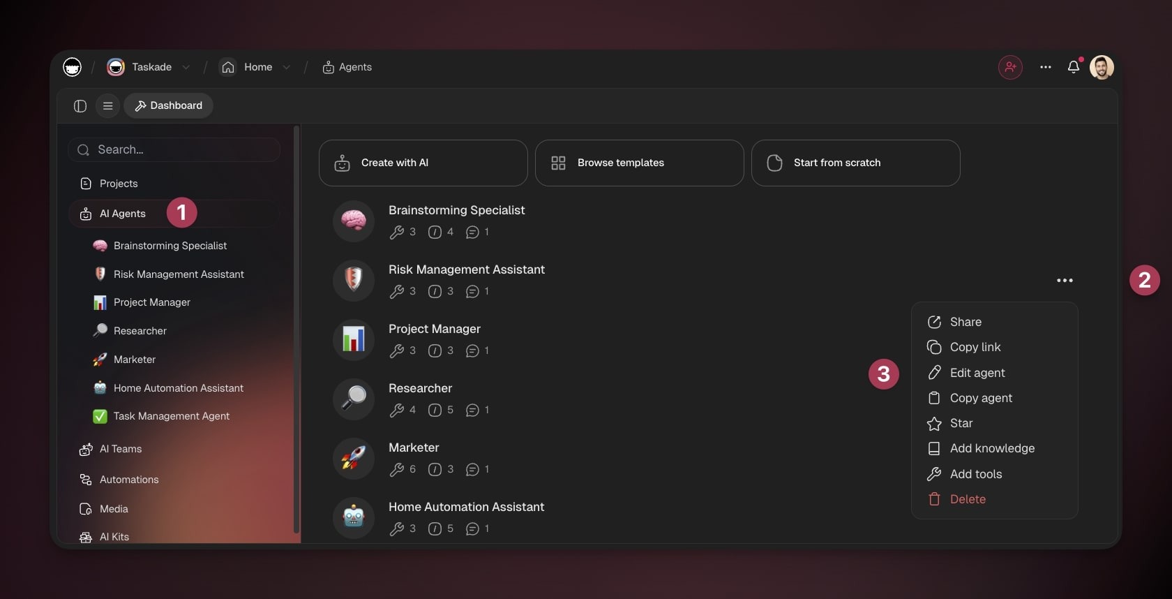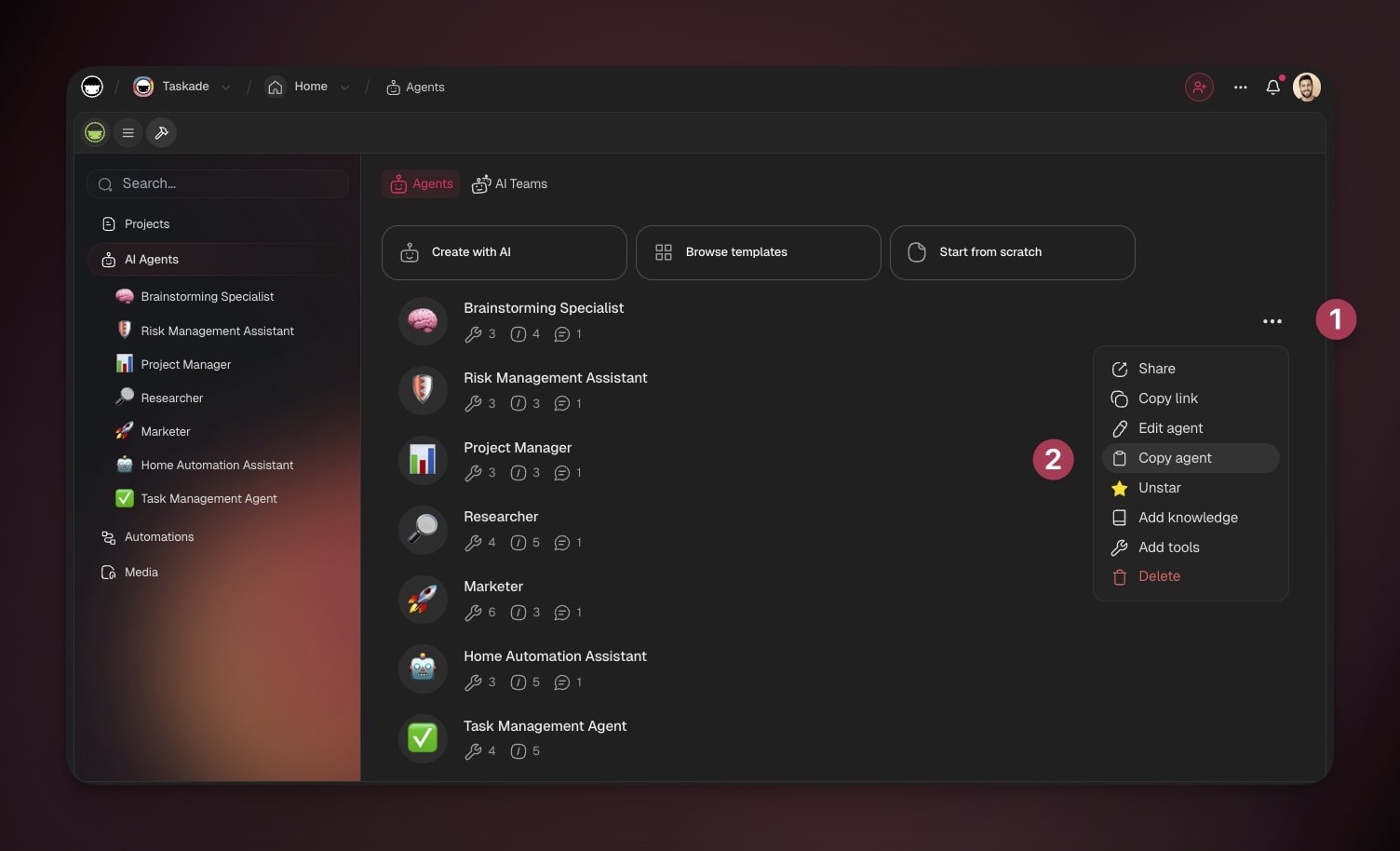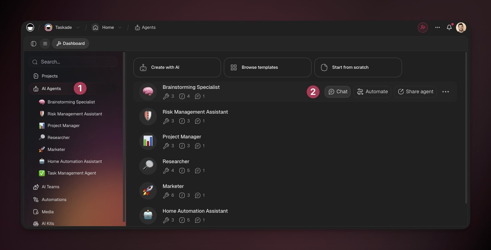 You can create new agents from anywhere in Taskade, while building Taskade Genesis apps, inside your automation workflows, in projects, or from the new main sidebar.