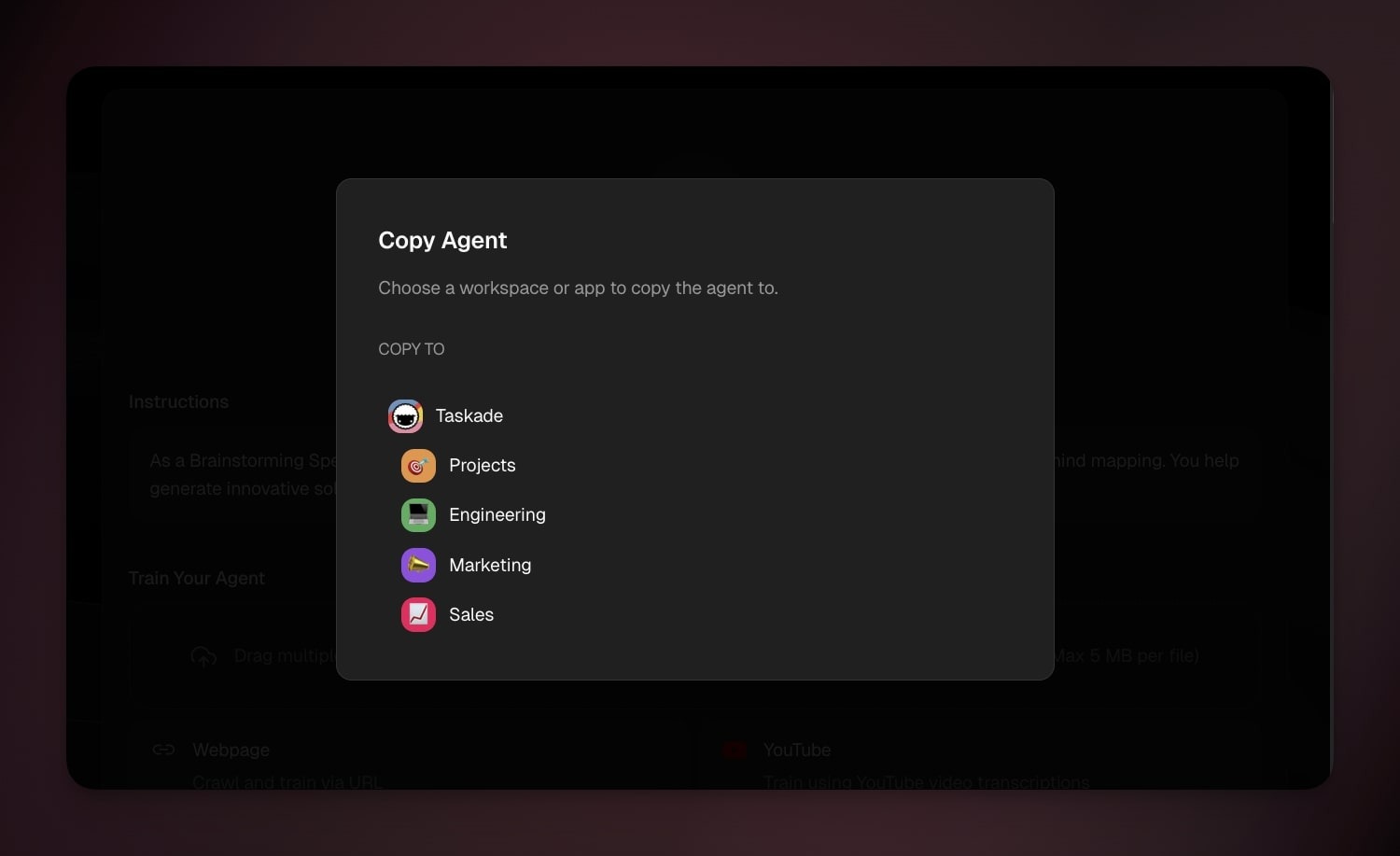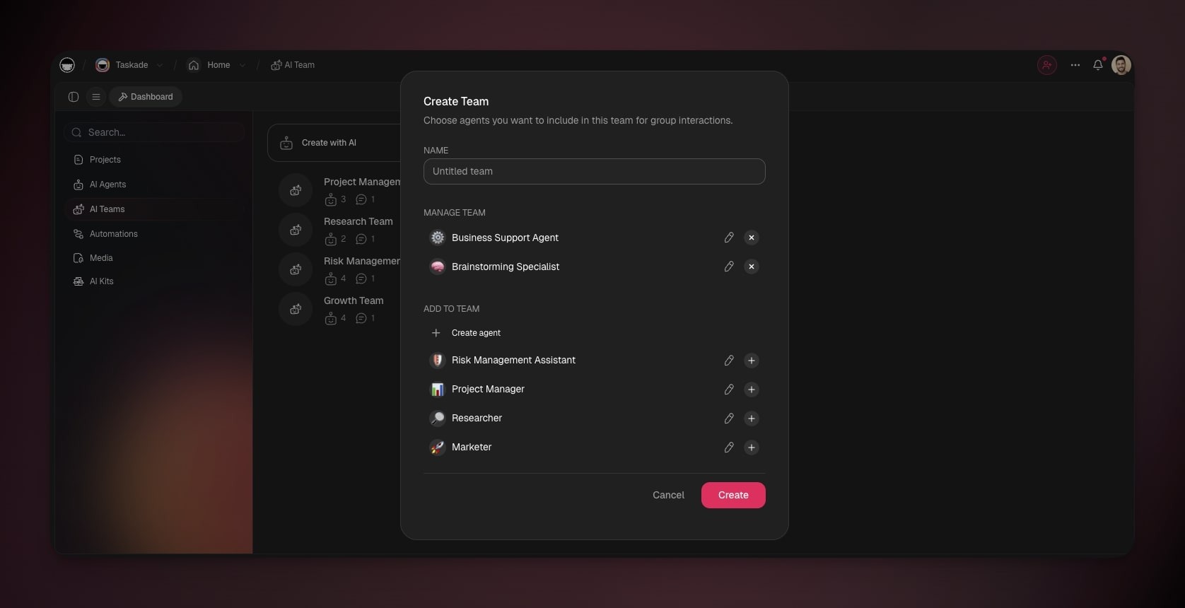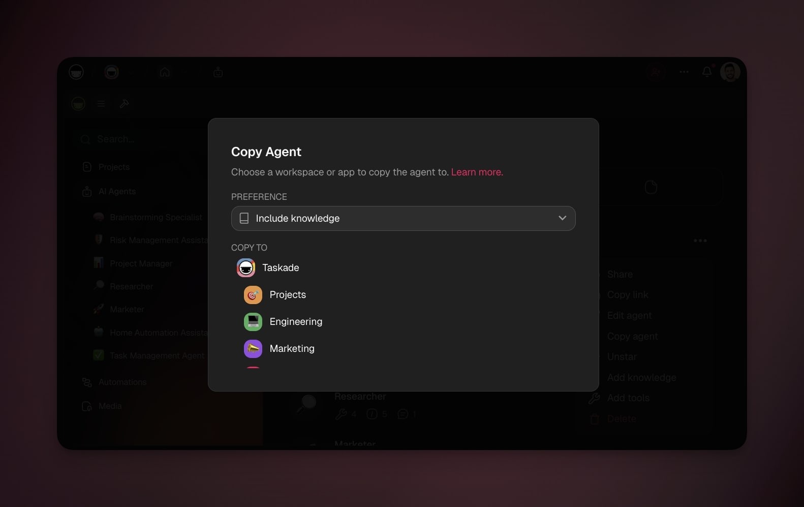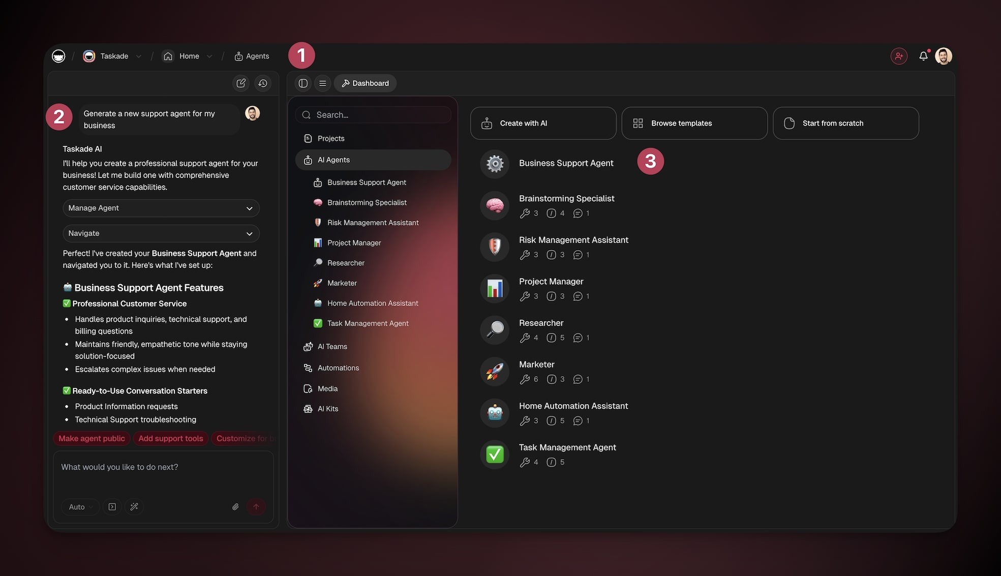 You can create new agents from anywhere in Taskade, while building Taskade Genesis apps, inside your automation workflows, in projects, or from the new main sidebar.