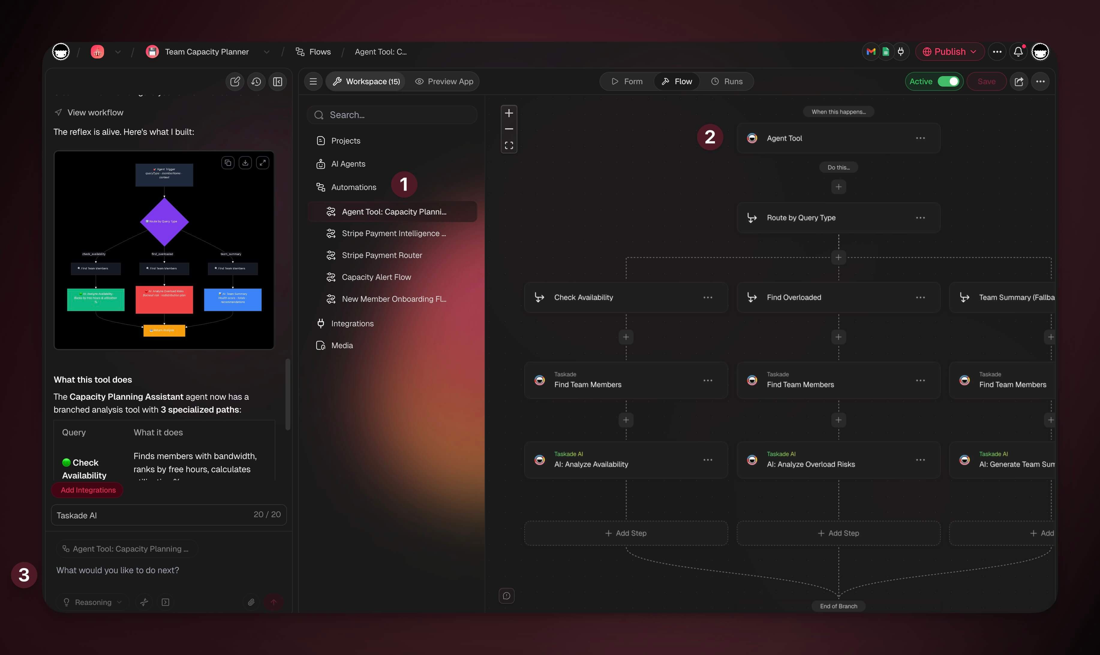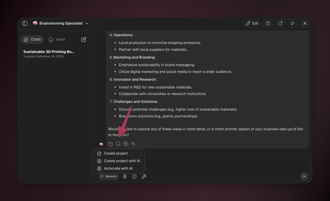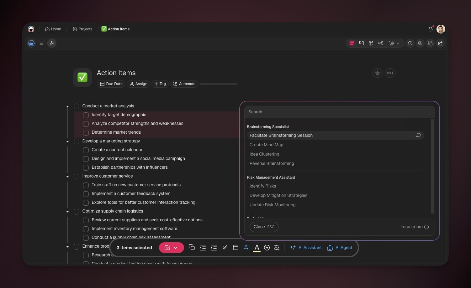 While Projects provide structured memory and Automations execute workflows, AI Agents supply the reasoning, decision-making, and context comprehension.