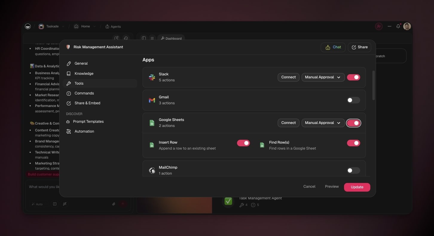 Agent Tools give your agents the ability to create projects and tasks, seamlessly exchange information with external platforms, and interact with each other.