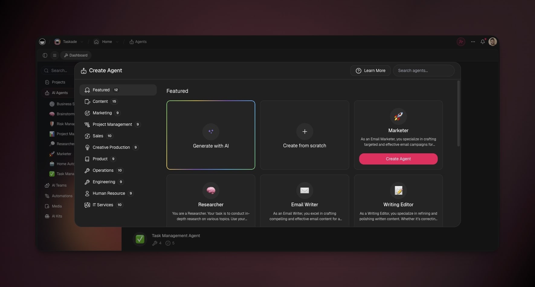 - Ask Taskade EVE to generate or select an agent.