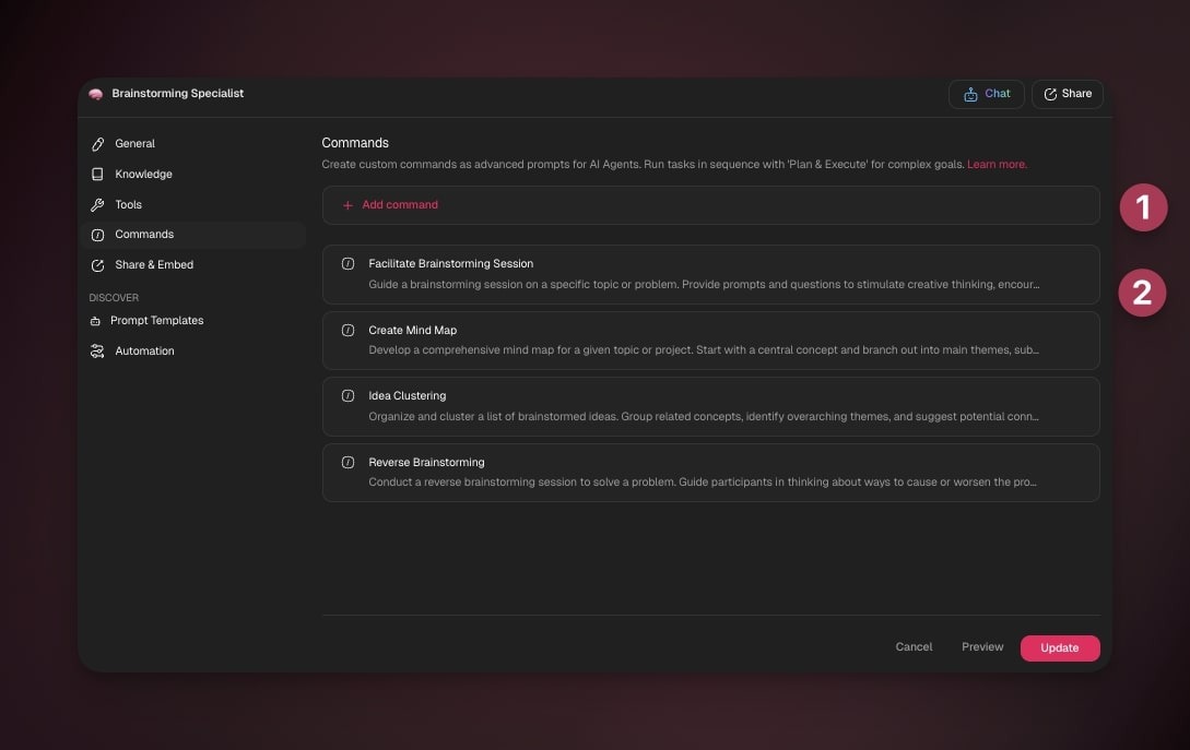 - Adjust placement and edit the agent commands/knowledge in the Agents tab.