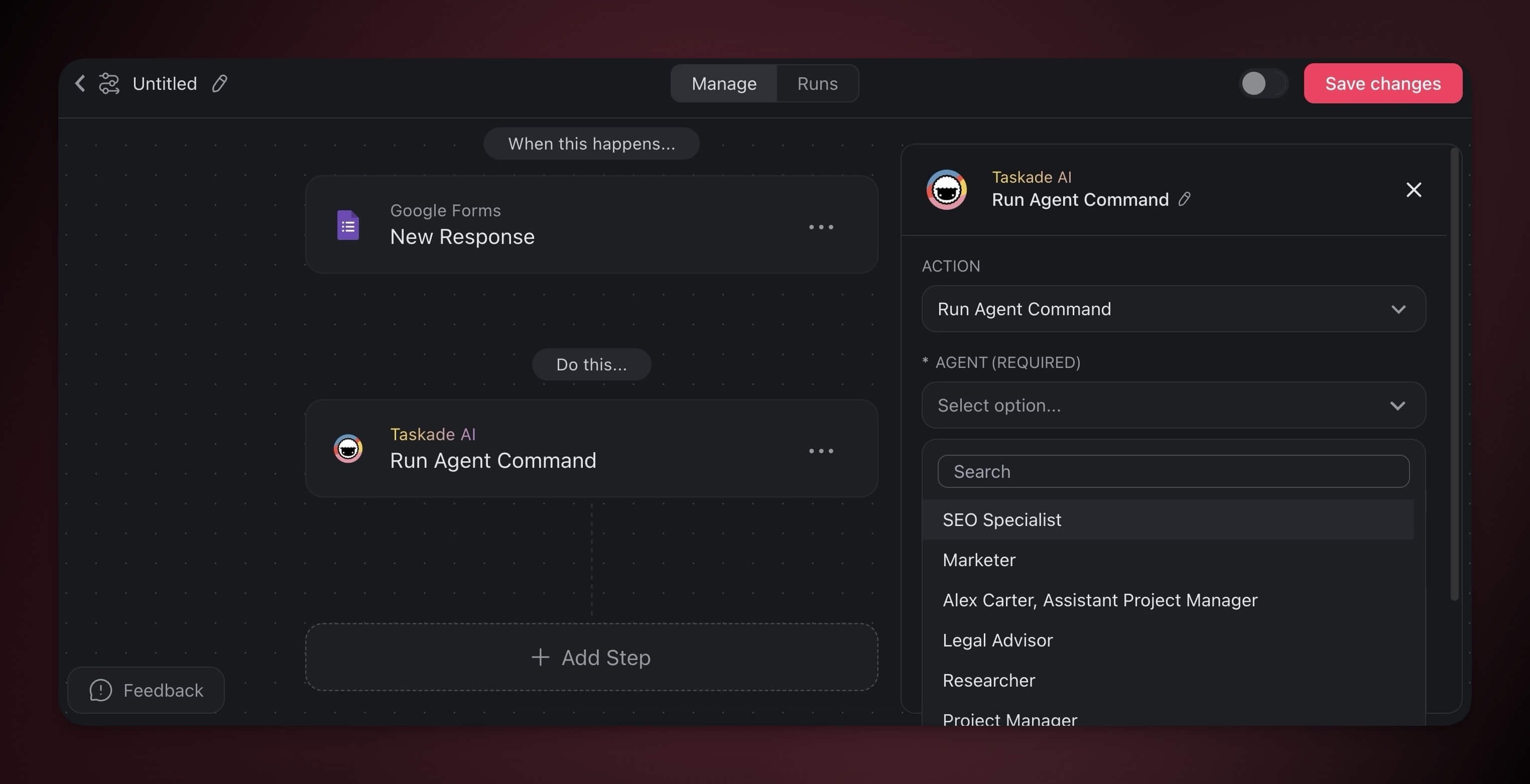 You can use your custom AI agents and Taskade AI commands in automation flows to put your projects on autopilot.