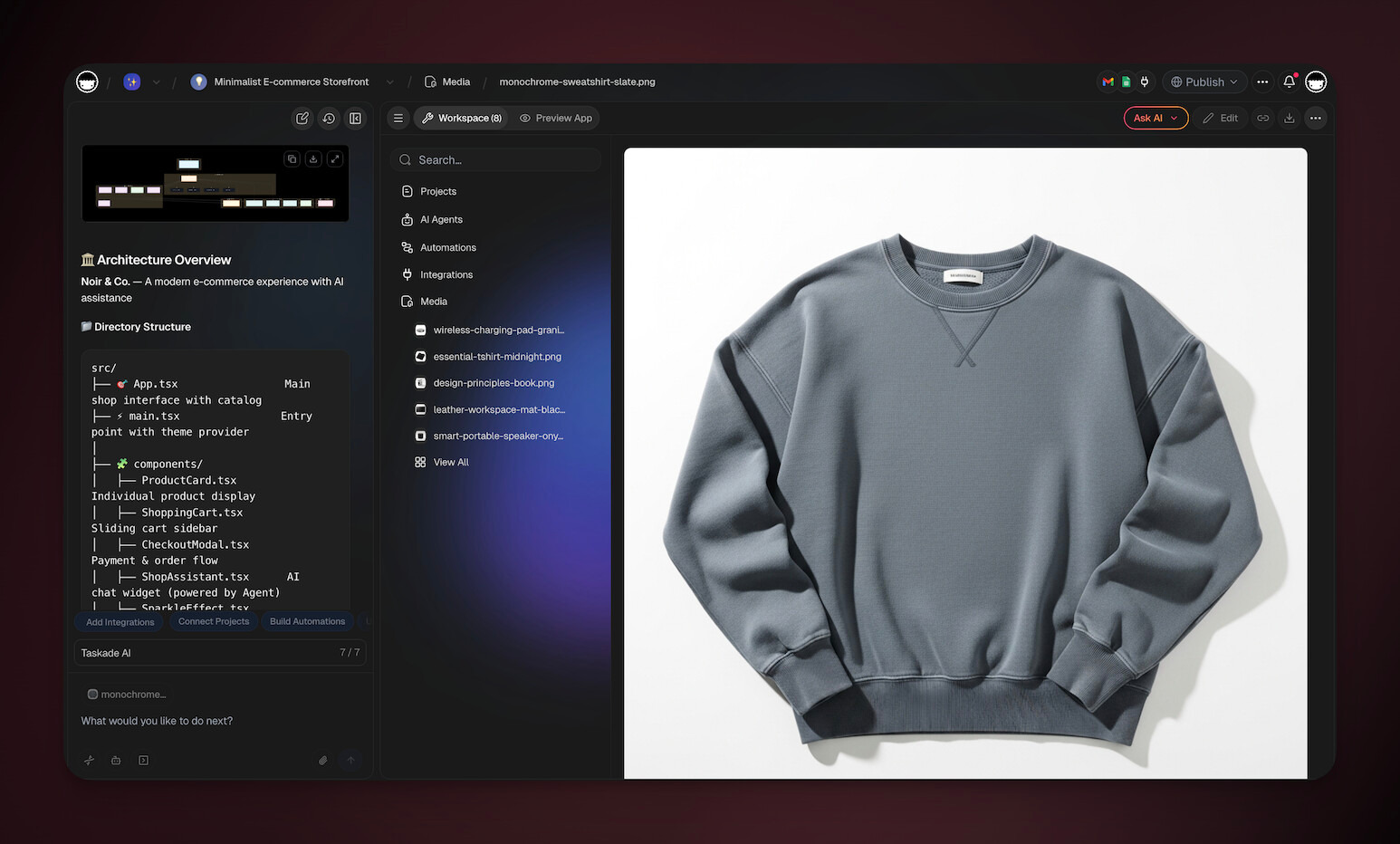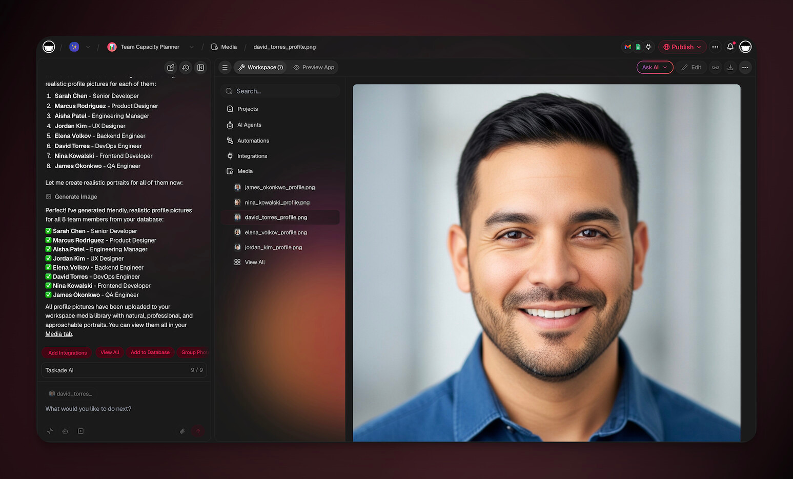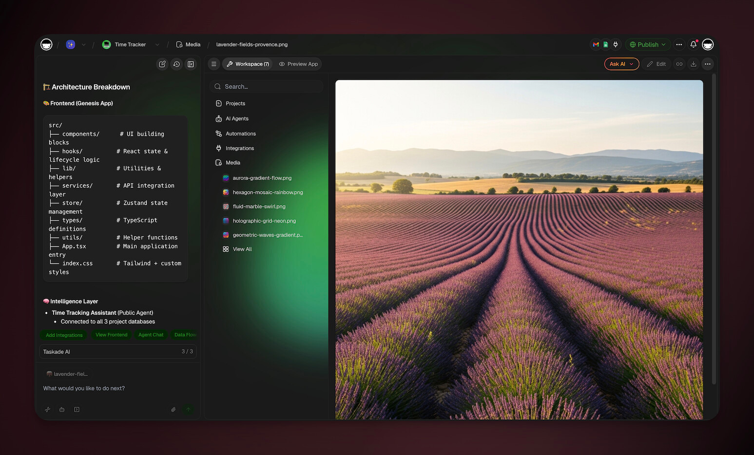 You can generate images for your Taskade Genesis apps natively, without extra tools, then reuse them across your app UI, projects, and Media library.