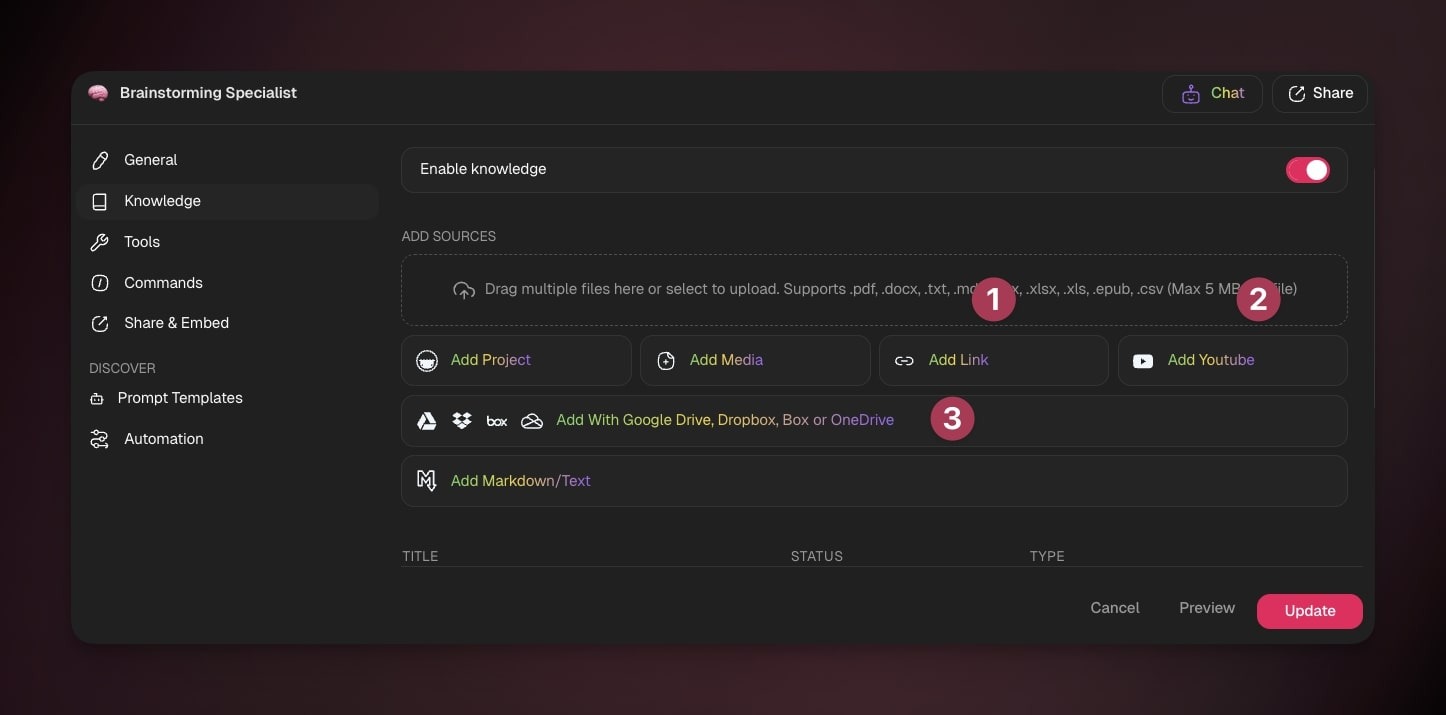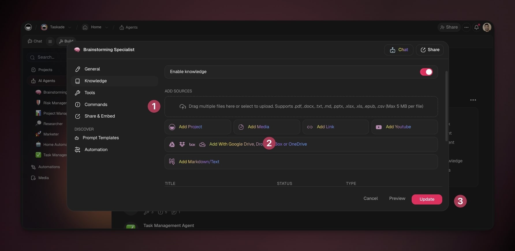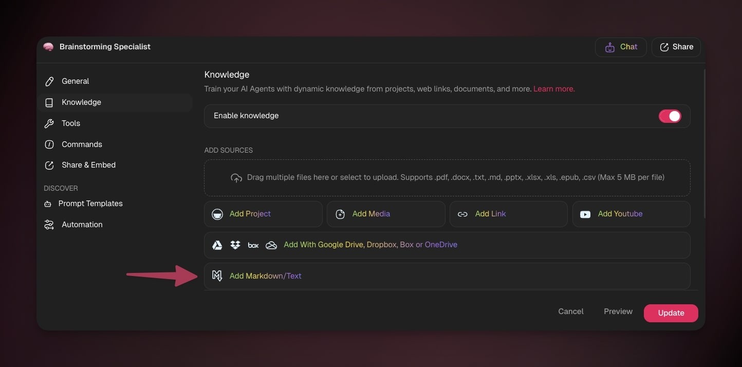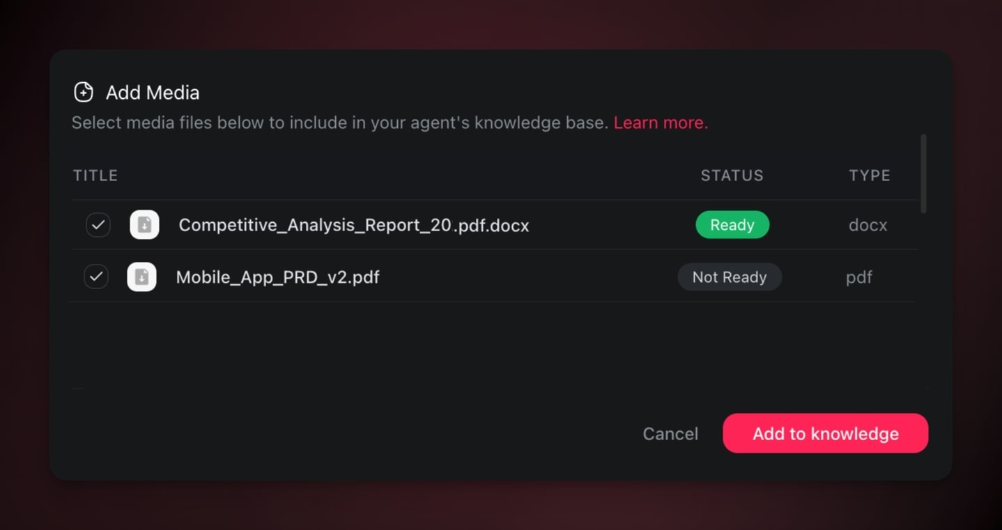 You can now quickly add more data to your agent's knowledge base by uploading multiple projects, links, and files at the same time. Here's how it works.